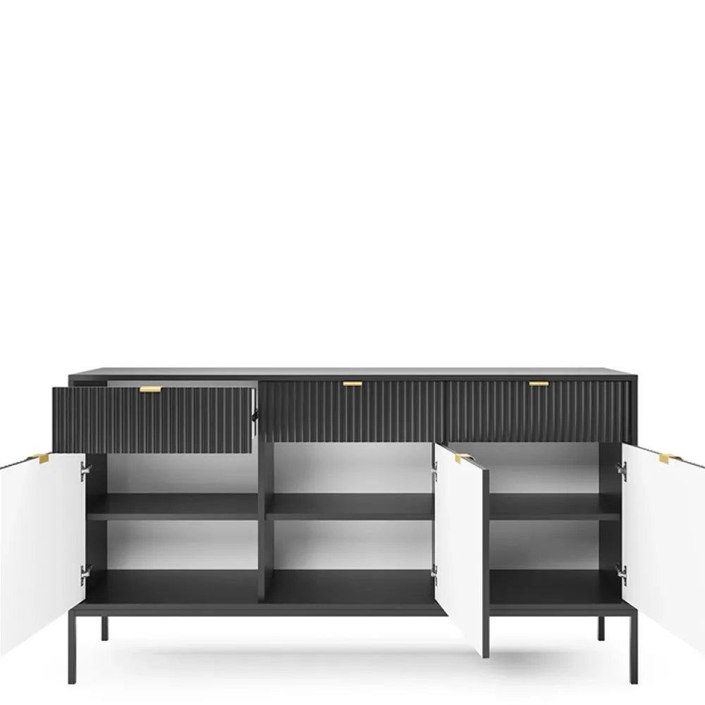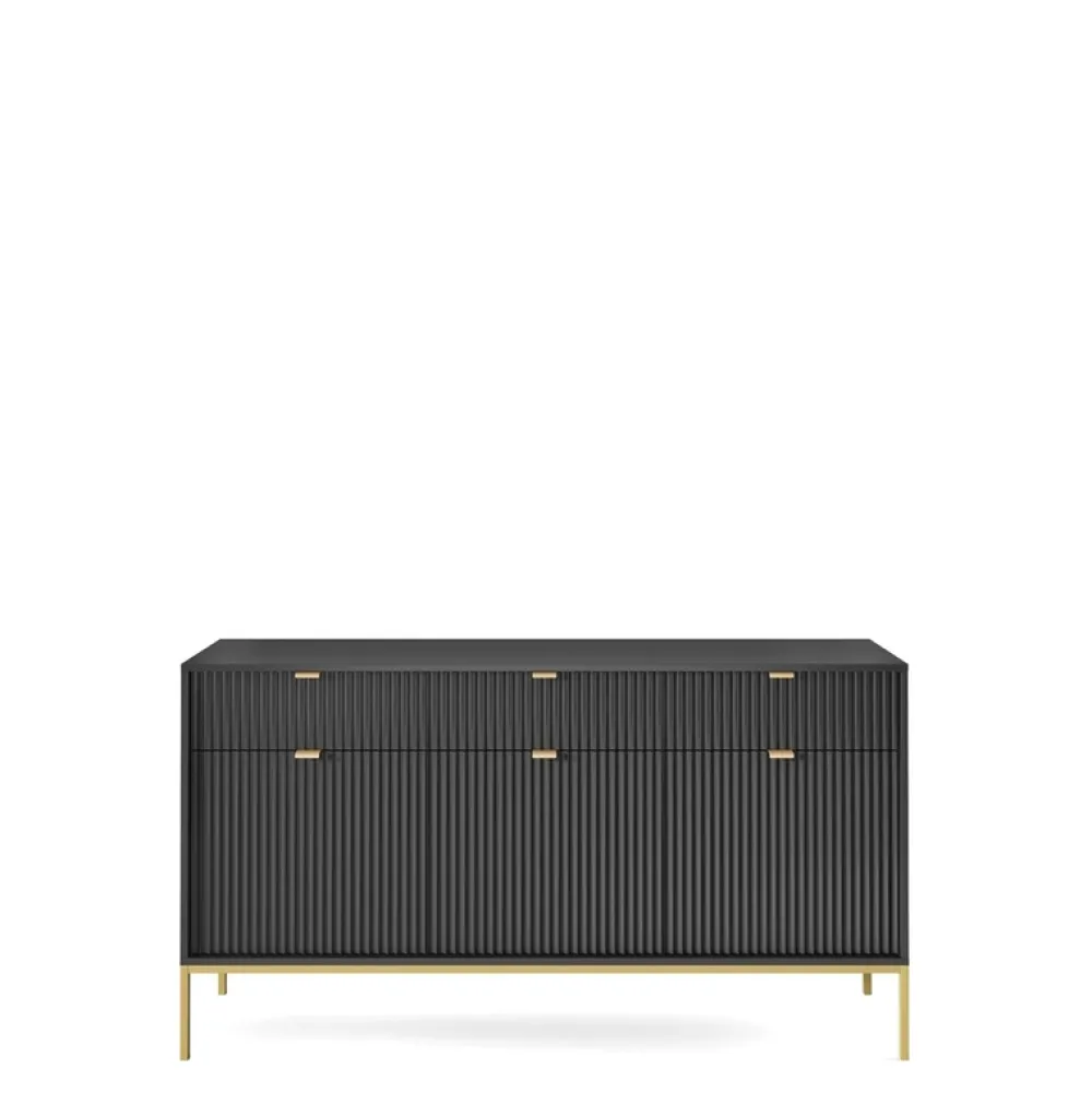 Fronty komody są ozdobione delikatnym, ryflowanym wzorem, który nadaje meblowi niepowtarzalnego charakteru. Wykonane z płyty MDF o grubości 18 mm, fronty również posiadają głęboki czarny kolor, tworząc spójną i elegancką całość.