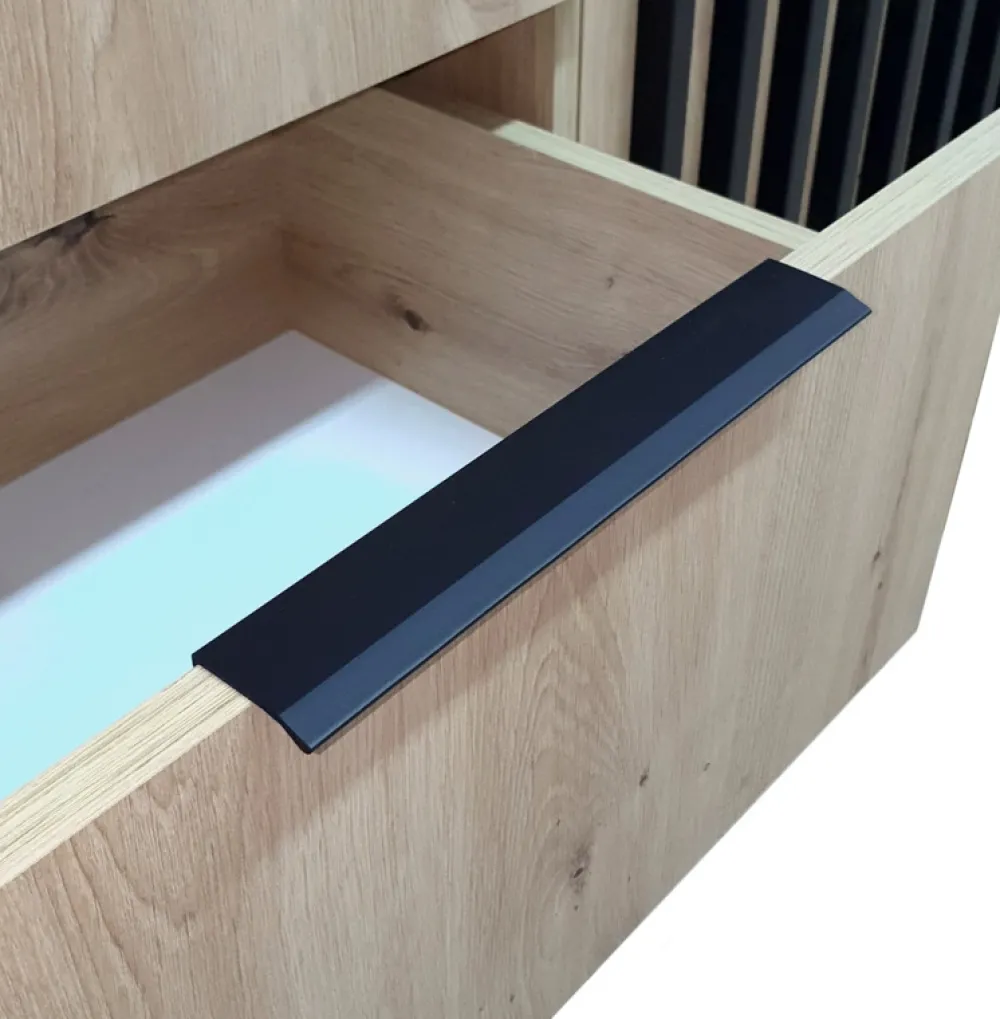 Dekoracyjne lamele oraz czarne metalowe uchwyty podkreślają nowoczesny wygląd komody, sprawiając, że staje się ona nie tylko praktycznym, ale także dekoracyjnym elementem pomieszczenia. Obrzeża zabezpieczone okleiną ABS gwarantują wysoką odporność na codzienne użytkowanie, co zapewnia długotrwałą satysfakcję z wyboru.