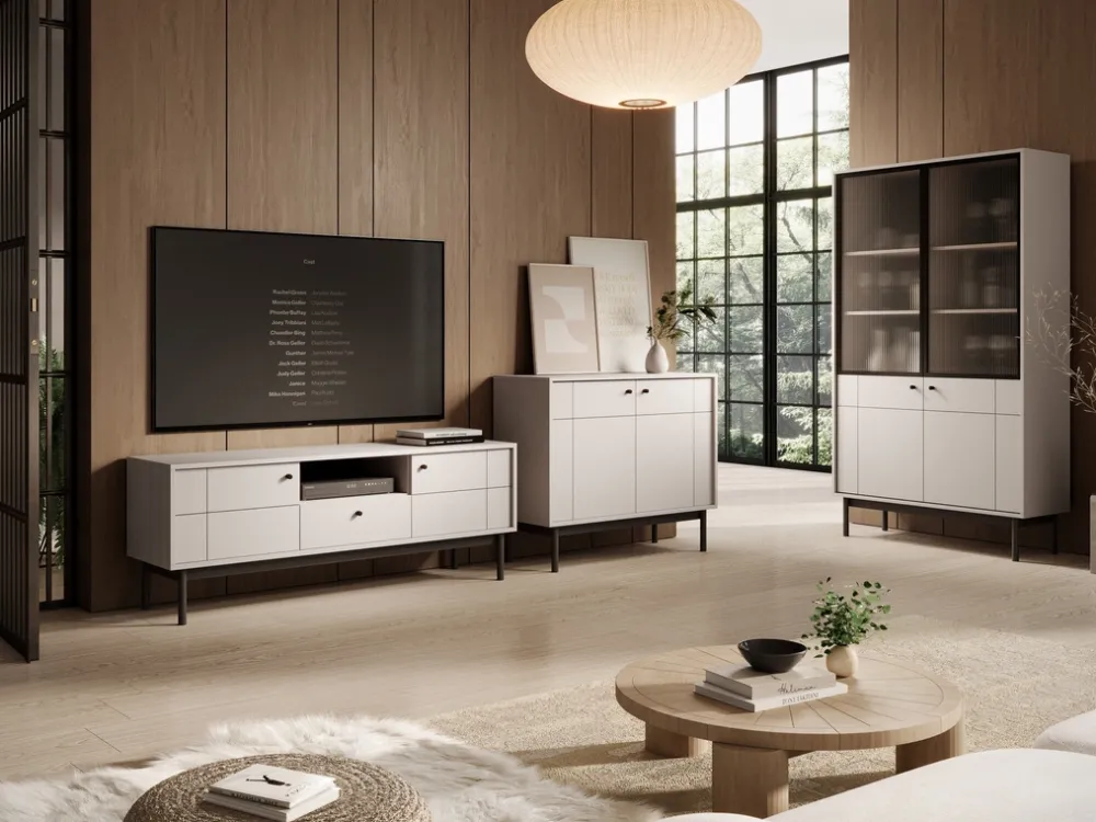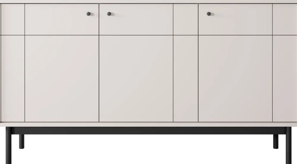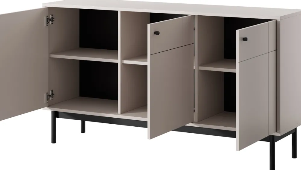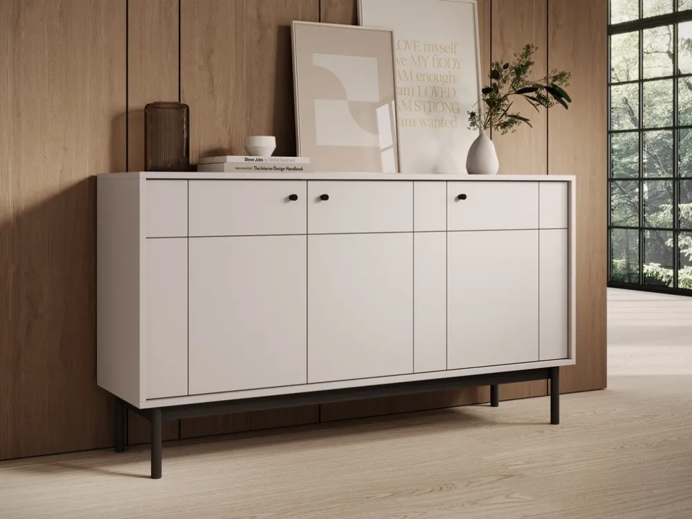Stylowa komoda o imponującej szerokości 153,5 cm JUVA to idealne połączenie elegancji i funkcjonalności, które doskonale uzupełni każde nowoczesne wnętrze. Została wyposażona w trzy drzwi z systemem cichego domyku, który zapewnia komfortowe, bezszelestne zamykanie – bez trzasków i niepotrzebnego hałasu. System ten podkreśla wysoką jakość wykonania mebla oraz wygodę codziennego użytkowania.