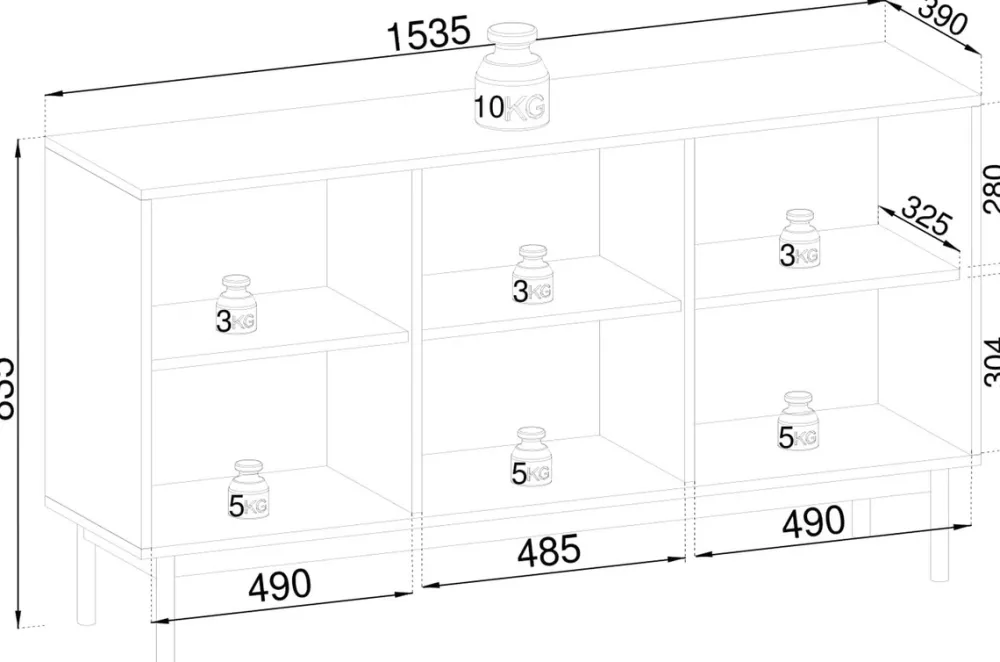 Za drzwiami komody kryją się praktyczne półki, które oferują mnóstwo przestrzeni na przechowywanie – od zastawy stołowej i książek po dekoracje czy niezbędne akcesoria. Przemyślany układ półek sprawia, że wnętrze komody pozwala na zachowanie idealnego porządku, a wszystkie przedmioty są zawsze na swoim miejscu.