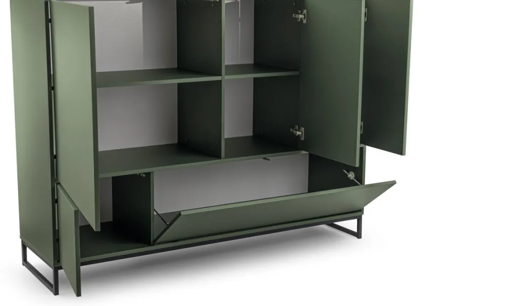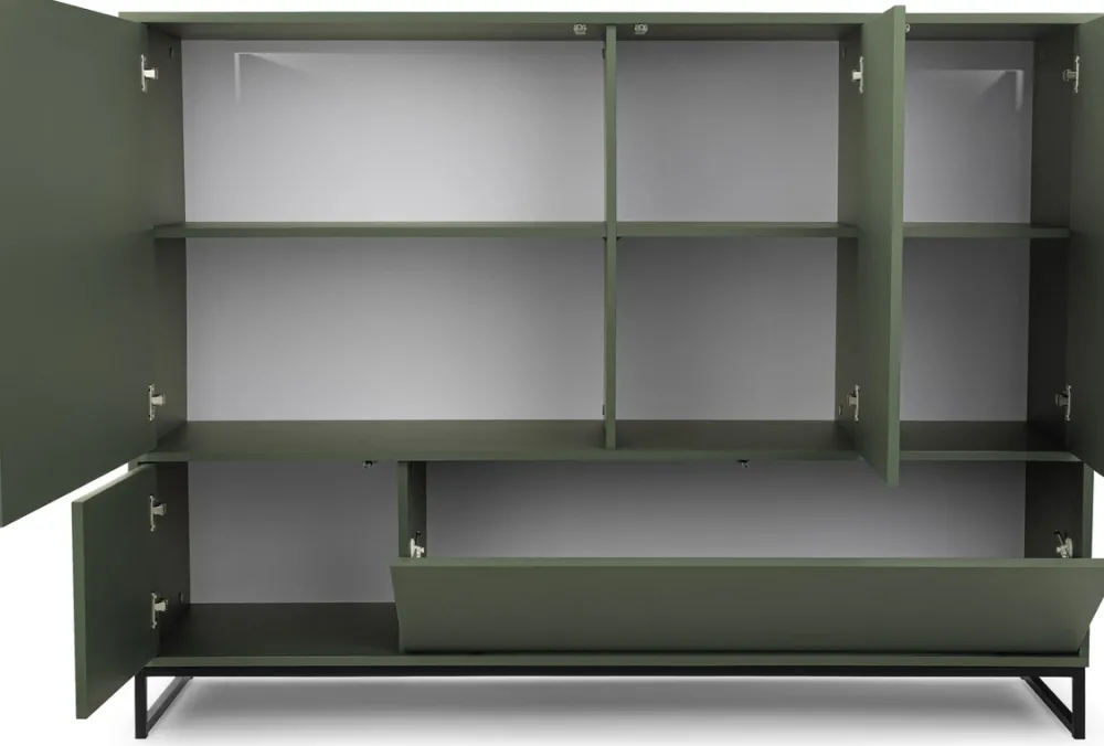 - Komoda GENEWA w kolorze butelkowej zieleni o szerokości 160 cm z 5 szafkami z półkami. Matowe wykończenie, system push to open oraz czarne metalowe nóżki. Duża pojemność i elegancki wygląd idealny do salonu, sypialni lub przedpokoju