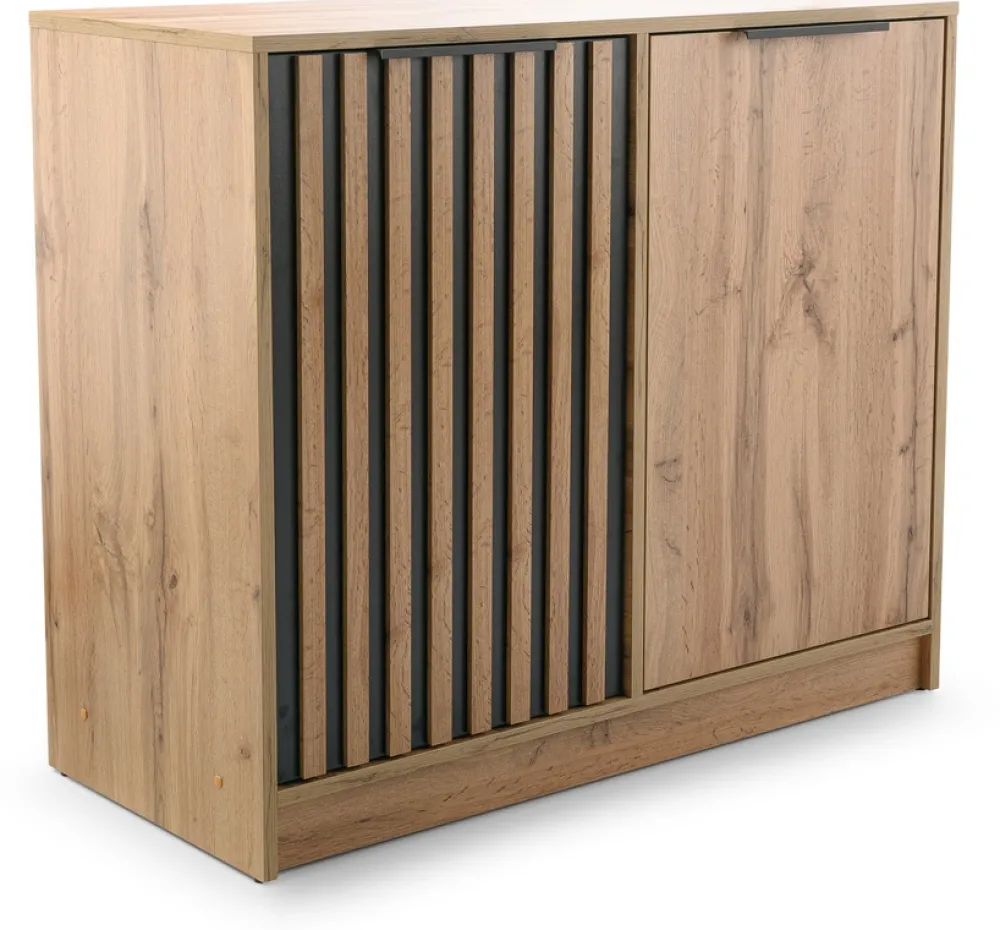 - Komoda z lamelami 100 cm BILL posiada parę drzwi, za każdymi z nich znajduje się półka na ubrania lub akcesoria. Komoda posiada korpus wykonany z płyty laminowanej 16 mm w kolorze dąb wotan. Zawiasy wzbogacone o mechanizm cichego domyku.