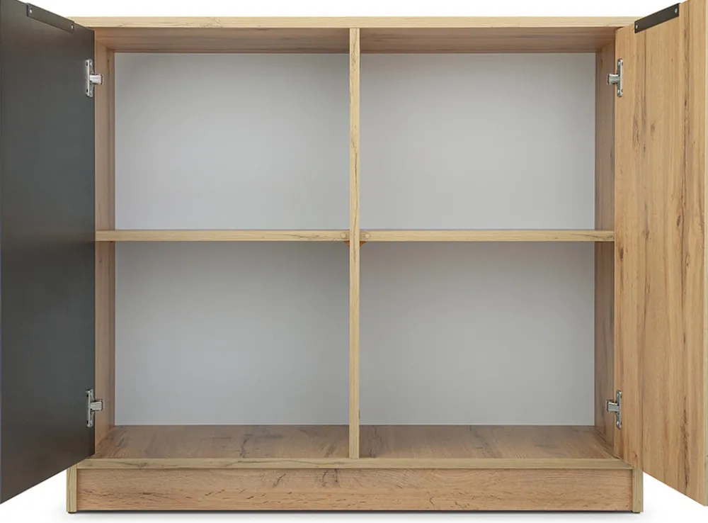 Komoda wyposażona jest w parę drzwi z systemem cichego domyku, co gwarantuje komfortowe i płynne zamykanie bez hałasu. Za drzwiami znajduje się przestronna półka, idealna do przechowywania książek, naczyń lub innych domowych akcesoriów. Dzięki temu komoda nie tylko świetnie wygląda, ale także pomaga w organizacji przestrzeni.