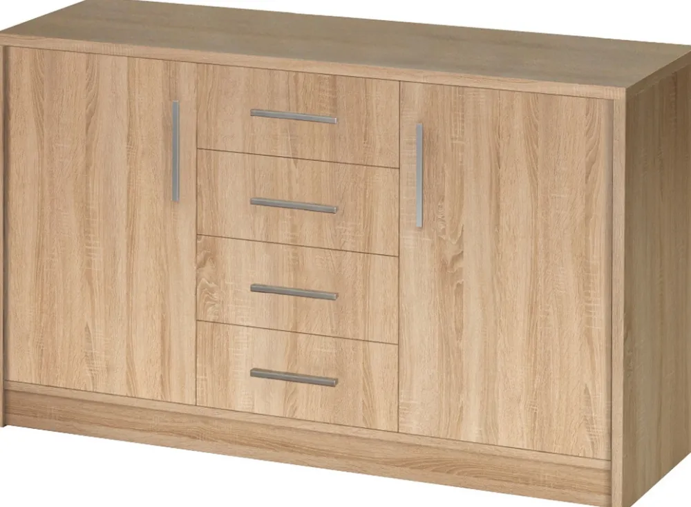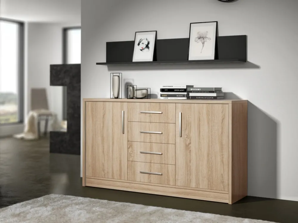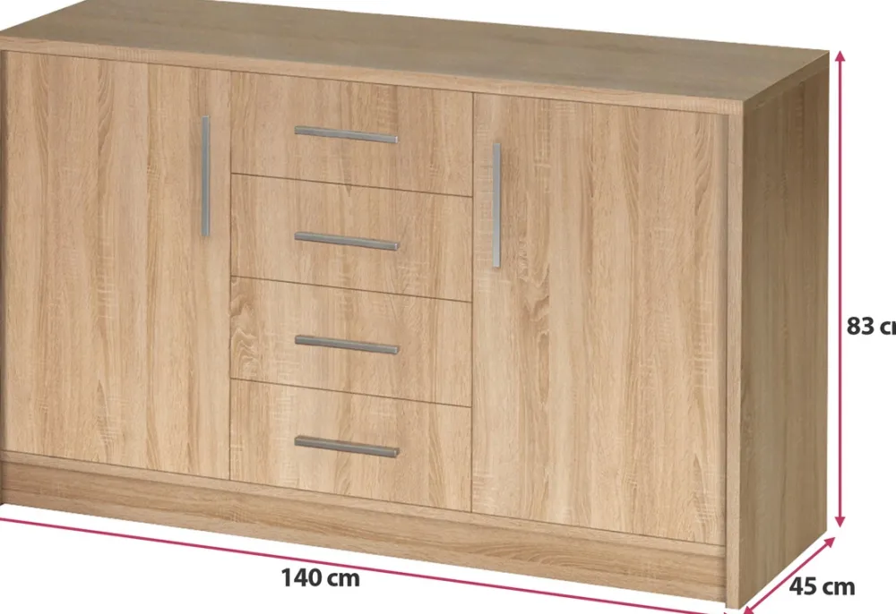 - Komoda 140 cm GORDON posiada drzwi po prawej i lewej stronie, gdzie za każdymi drzwiami znajduje się jedna półka. Komoda w swojej środkowej części posiada cztery szuflady, które doskonale sprawdzą się do przechowania drobnych akcesoriów i bielizny.