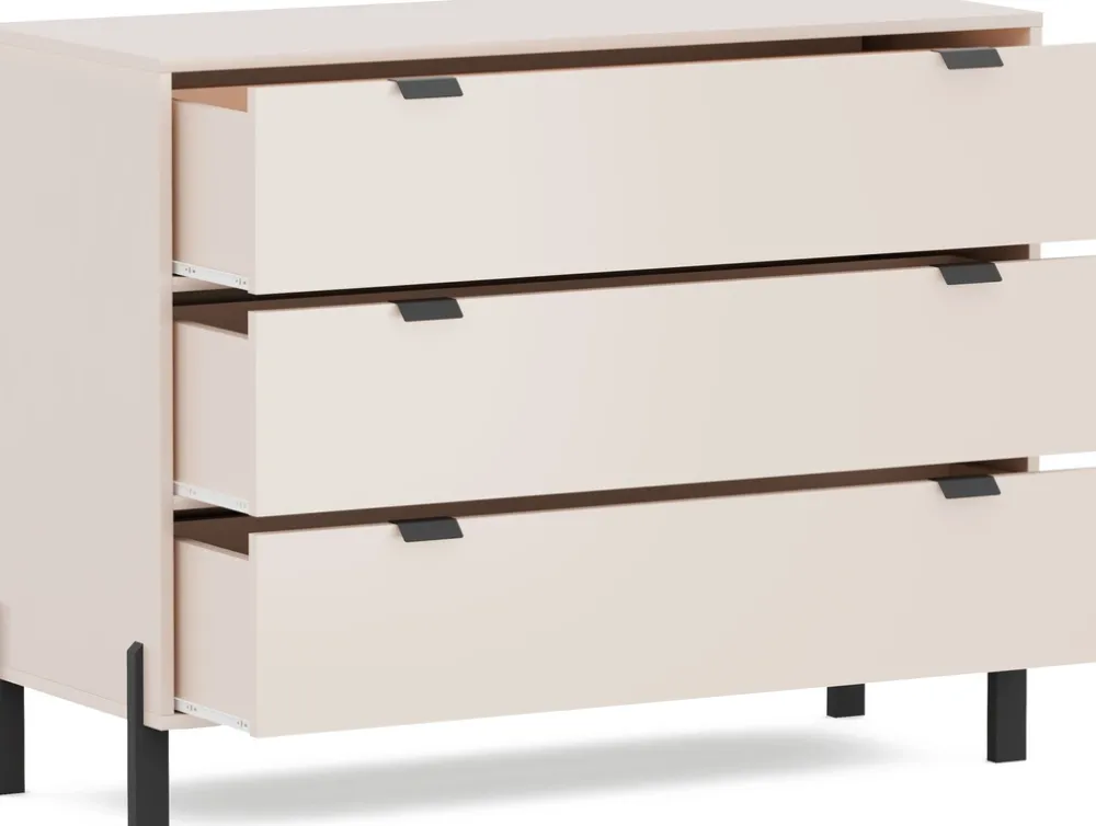 - Nowoczesna komoda z 3 pojemnymi szufladami, w matowym wykończeniu w kolorze beżu piaskowego. Solidna płyta laminowana, czarne uchwyty i nóżki. Idealna do sypialni, salonu lub przedpokoju.