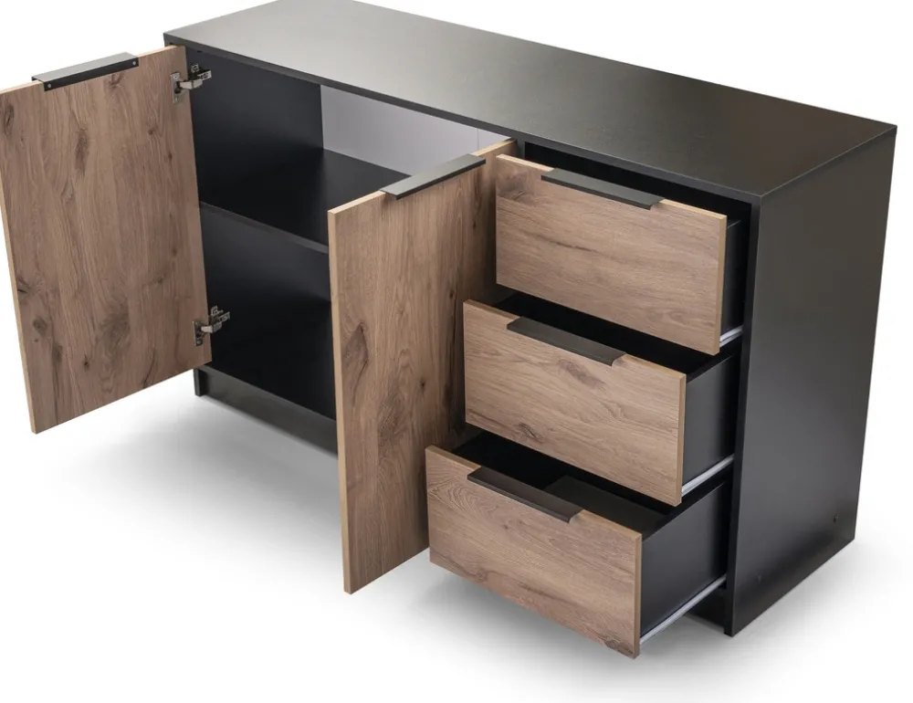- Komoda dwudrzwiowa 138 cm LANTE posiada dwie półki na ubrania oraz trzy głębokie szuflady po prawej stronie. Uchwyty komody zostały wykonane z aluminium w czarnym kolorze. Komoda wykonana z płyty laminowanej 16 mm. Obrzeża wykończone PCV.