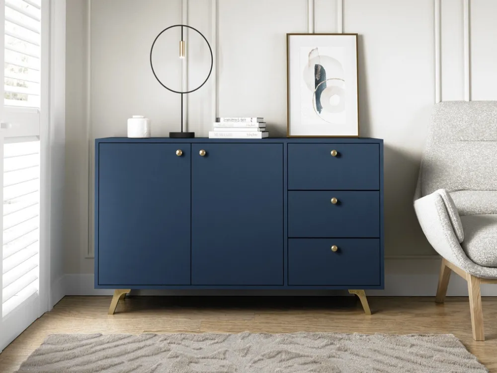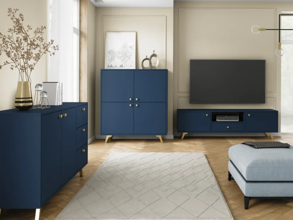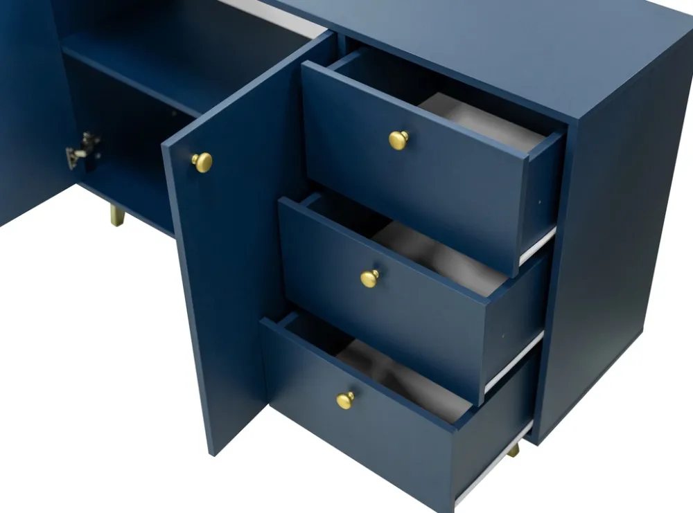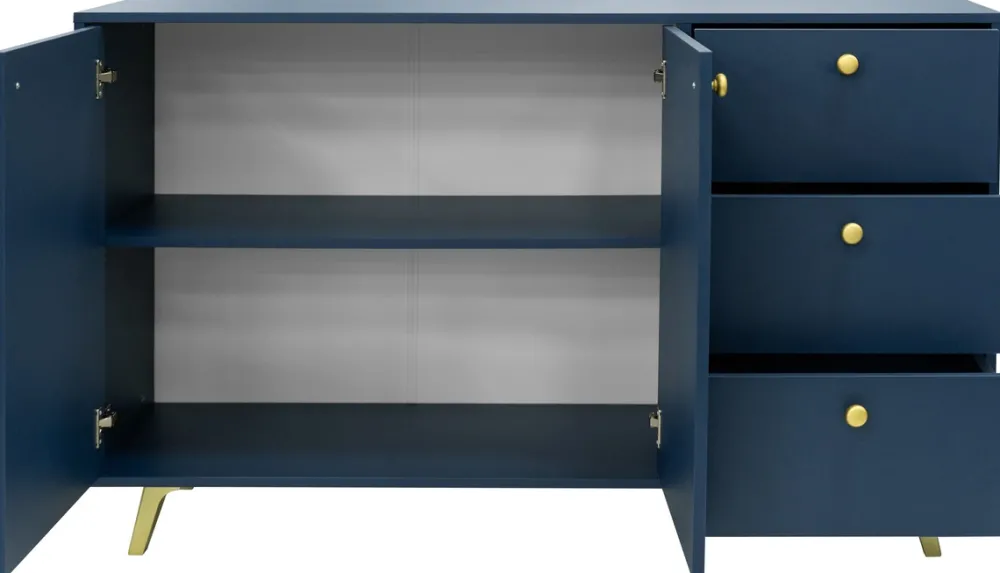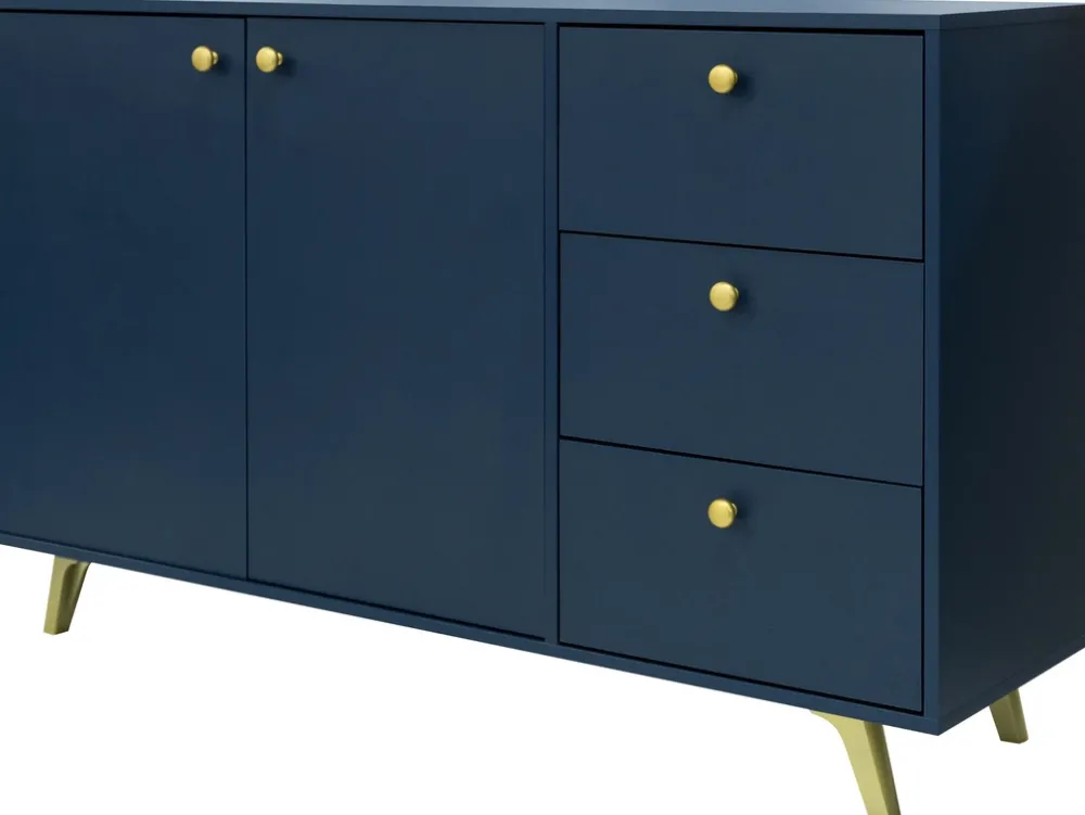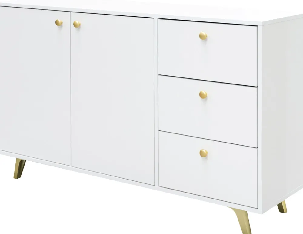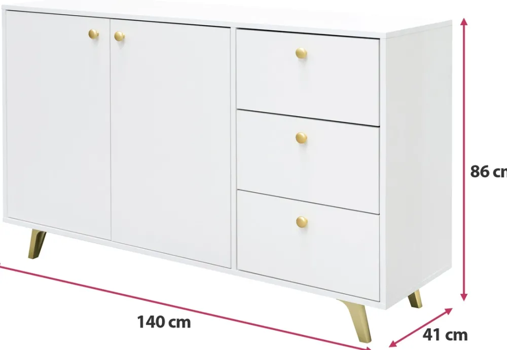 - Komoda z szufladami 140 cm SELMA posiada parę drzwi po lewej stronie oraz trzy pojemne szuflady po prawej stronie. Komoda stoi na wysokich złotych nóżkach, które pozwalają na swobodne sprzątanie. Mebel wykonany z płyty laminowanej 16 mm.