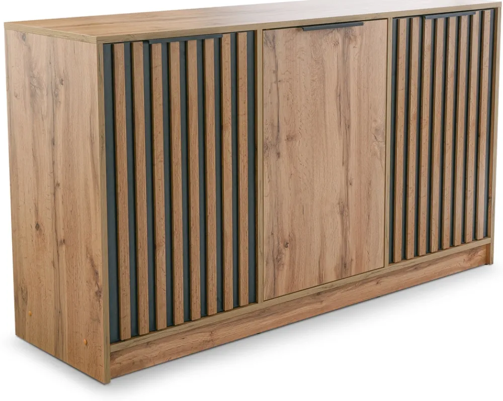 - Komoda z lamelami 140 cm BILL posiada trzy drzwi, za każdymi z nich znajduje się półka na ubrania lub akcesoria. Komoda posiada korpus wykonany z płyty laminowanej 16 mm w kolorze dąb wotan. Zawiasy wzbogacone o mechanizm cichego domyku.