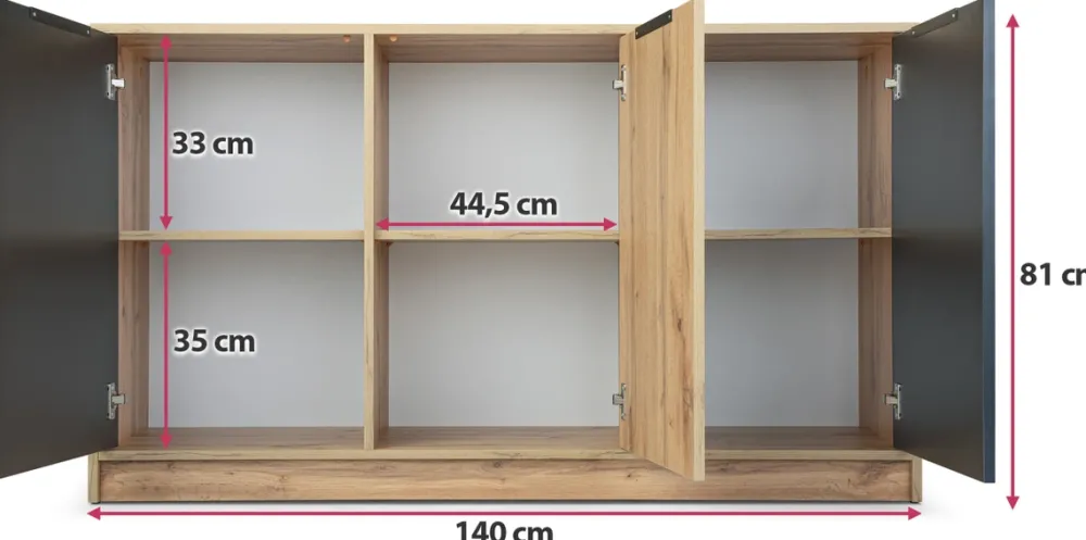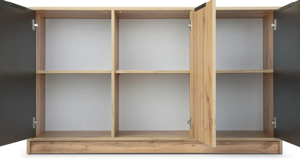 Komoda wyposażona jest w trzy drzwi z systemem cichego domyku, co gwarantuje komfortowe i płynne zamykanie bez hałasu. Za drzwiami znajduje się przestronna półka, idealna do przechowywania książek, naczyń lub innych domowych akcesoriów. Dzięki temu komoda nie tylko świetnie wygląda, ale także pomaga w organizacji przestrzeni.