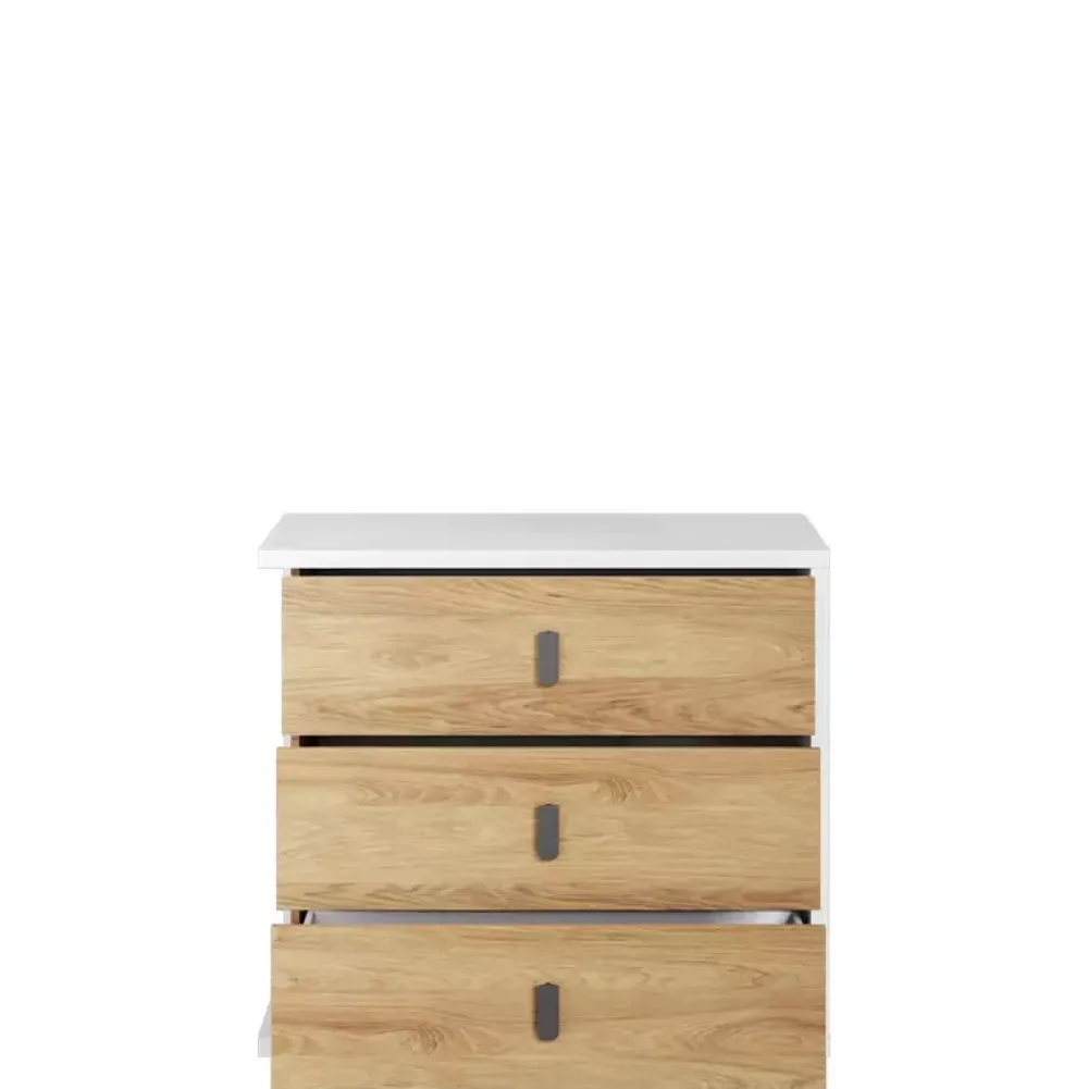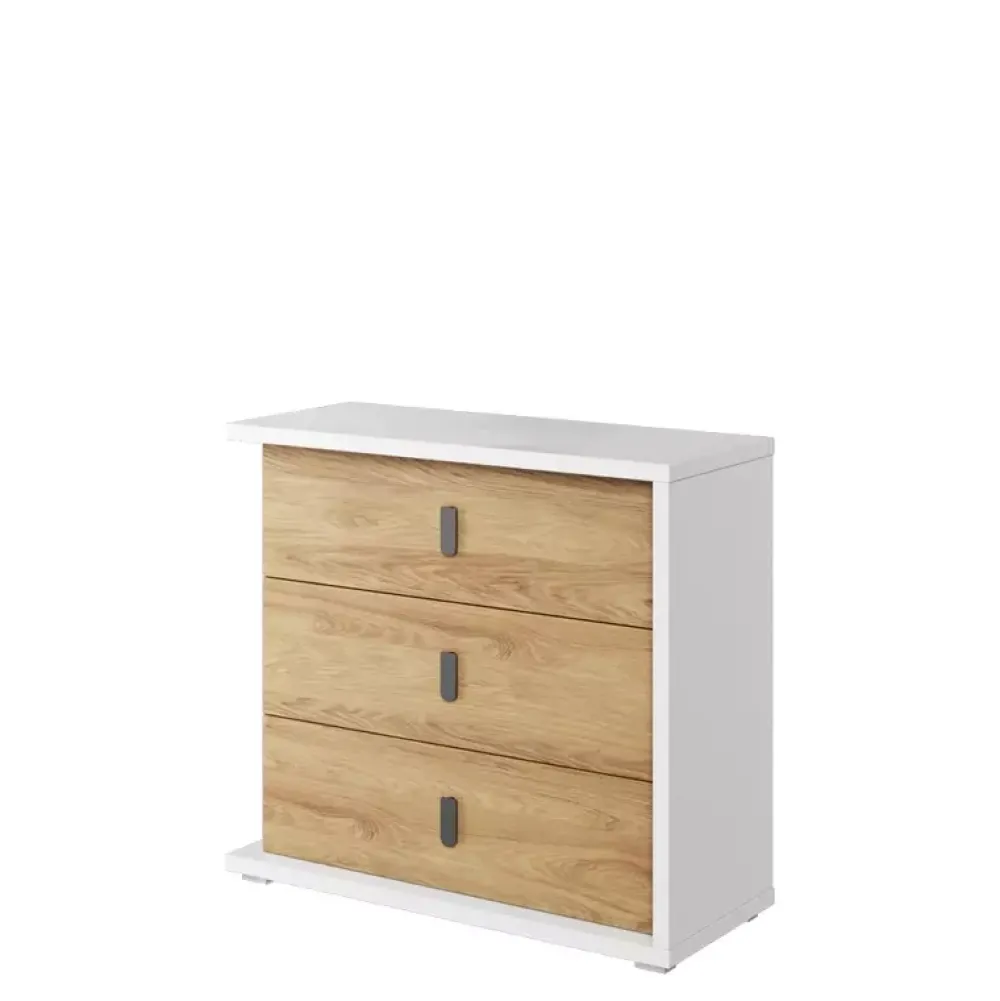 Komoda dziecięca SIMI została wyposażona w trzy pojemne szuflady metalowymi uchwytami osadzone na prowadnicach kulkowych. Komoda do pokoju dziecięcego z szufladami została wykonana w nowoczesnej stylistyce podążając za współczesnymi trendami aranżacji pokoi dziecięcych, połączenie koloru bieli alpejskiej z ciepłym kolorem dębu hikory naturalnej uczyni pomieszczenie przytulnym.