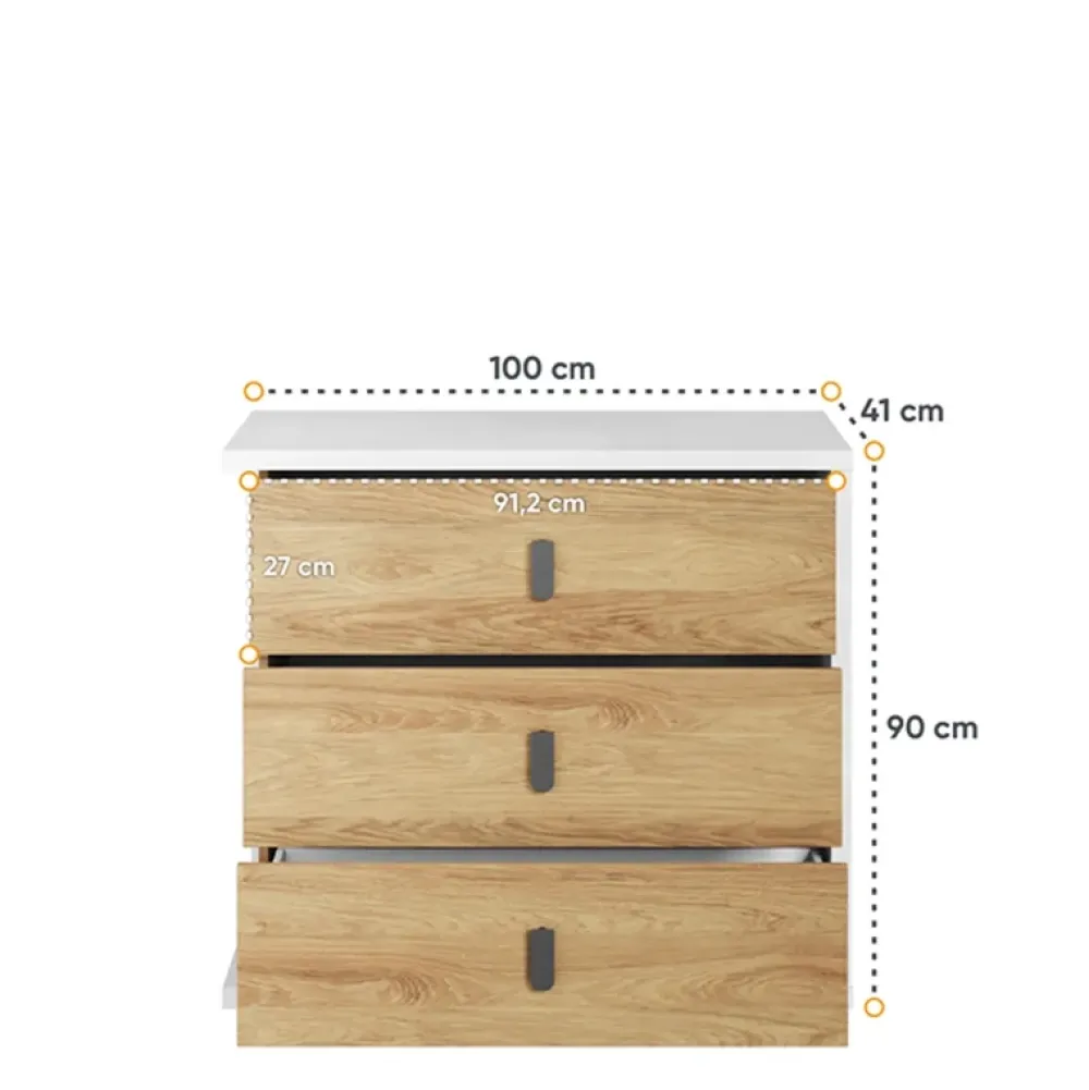 - Komoda dziecięca SIMI o szerokości 100 cm została wykonana w nowoczesnej stylistyce podążając za współczesnymi trendami aranżacji pokoi dziecięcych. Komoda została wyposażona w trzy pojemne szuflady osadzone na prowadnicach kulkowych.