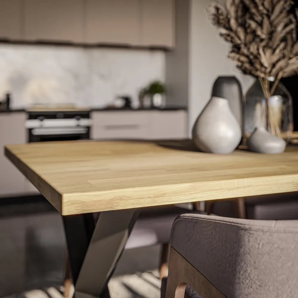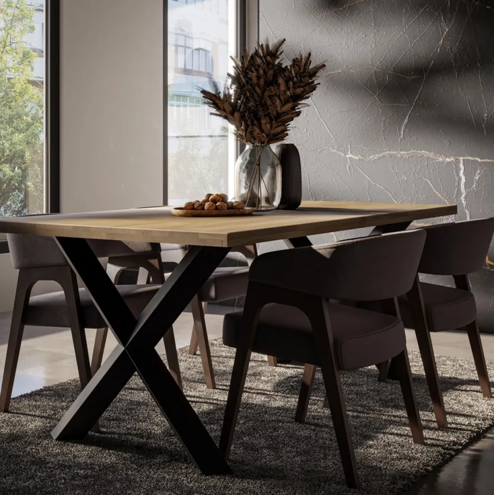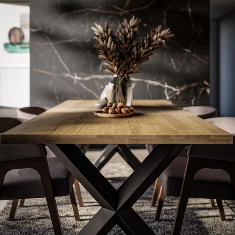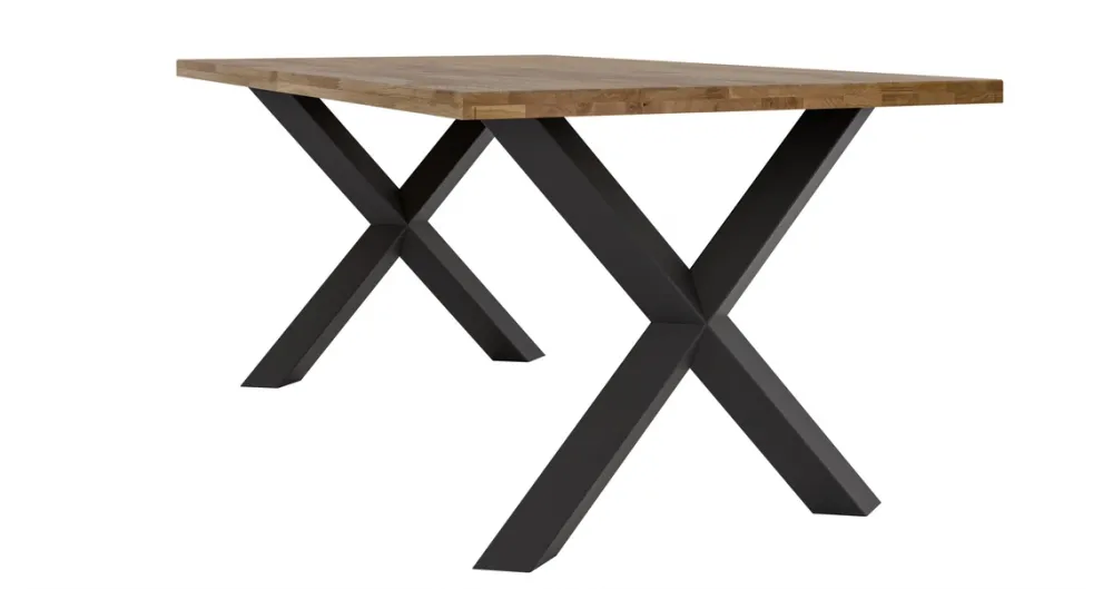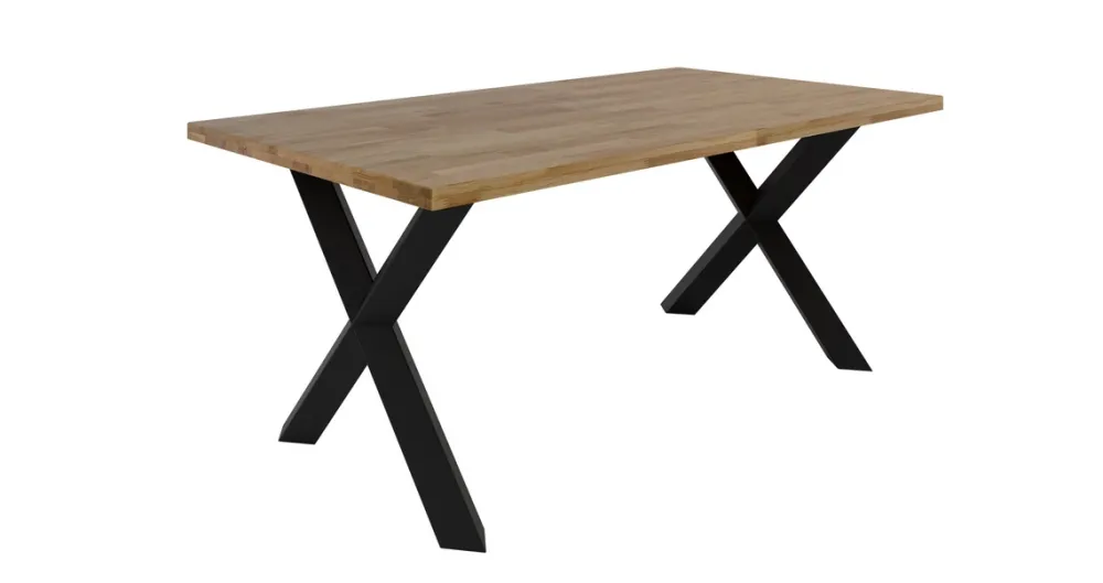 Stół loftowy z litego drewna MERLIVO to kwintesencja ponadczasowego designu, który łączy surowość metalu z ciepłem naturalnego dębu. Idealny do jadalni, kuchni lub salonu w stylu industrialnym, nowoczesnym czy minimalistycznym. Blat z olejowanego drewna dębowego emanuje naturalnym urokiem, a solidne metalowe nogi w formie litery X dodają mu charakteru i stabilności.