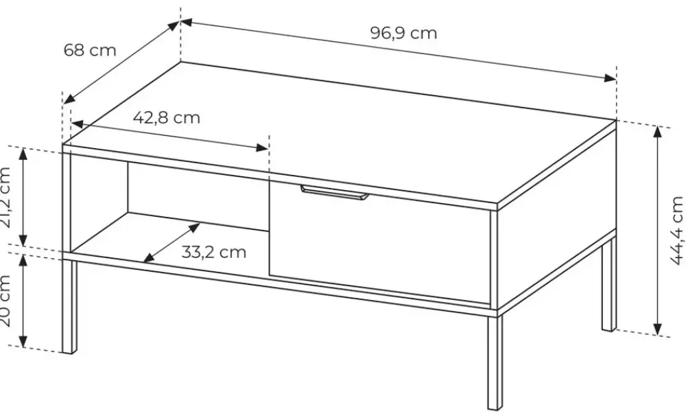 Design stolika dopełniają czarne, 20 cm metalowe nogi, które dodają elegancji i stabilności całej konstrukcji. Nowoczesny wygląd i funkcjonalność tego mebla sprawią, że będzie idealnym uzupełnieniem Twojego salonu, a Ty z przyjemnością spędzisz przy nim długie godziny relaksu.