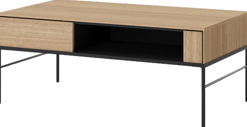 - Stolik kawowy VISSO posiada blat o wymiarze 110×60 cm, pod którym znajduje się półka na pilot lub inne akcesoria. Nóżki stolika zostały wykonane z metalu w czarnym kolorze. Stolik wykonany z płyty laminowanej 16 mm w kolorze dąb linearny.