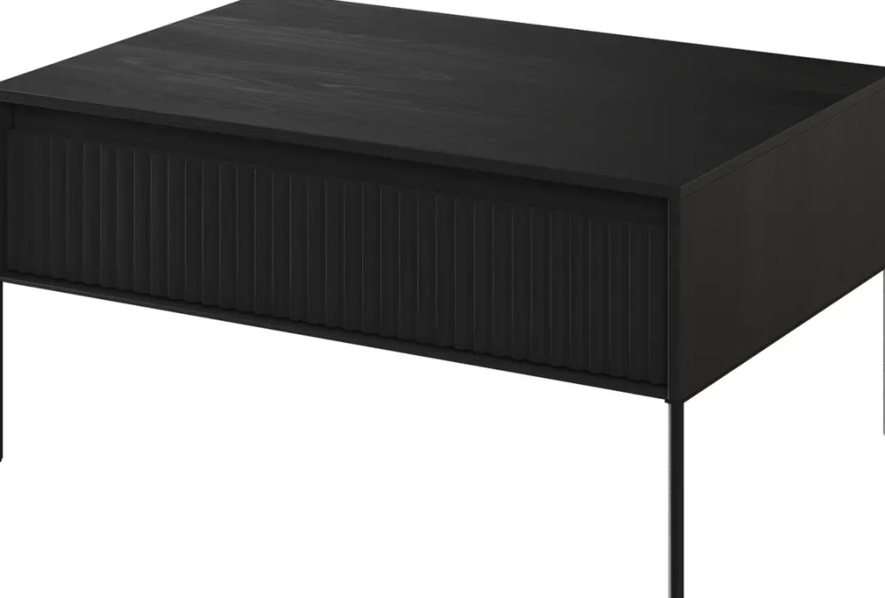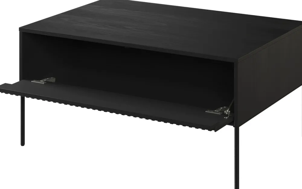 Jego front wykonany jest z 18 mm płyty MDF, na której uwagę przyciąga ryflowany wzór frezowany w prostym kształcie. To wyrafinowane zdobienie na tle czerni dodaje meblowi głębi i wyrazistości. Solidny korpus stolika, stworzony z 16 mm płyty laminowanej, gwarantuje trwałość i stabilność, jednocześnie podkreślając nowoczesny styl.
