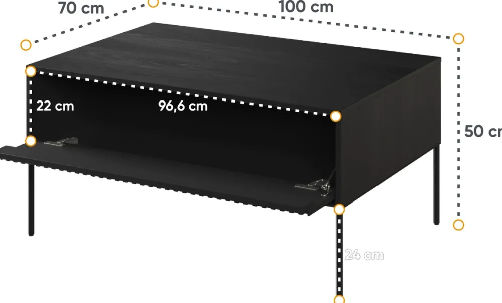 Przy szerokości 100 cm, stolik kawowy do salonu, jest idealnym miejscem do porannej kawy lub wieczornej herbaty, oferując równocześnie praktyczne miejsce do przechowywania. Wnęka za drzwiami pozwala na schowanie drobiazgów, takich jak książki czy piloty.