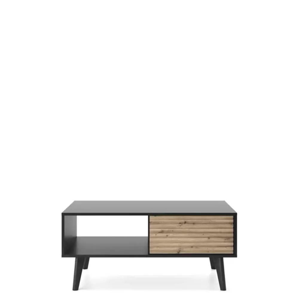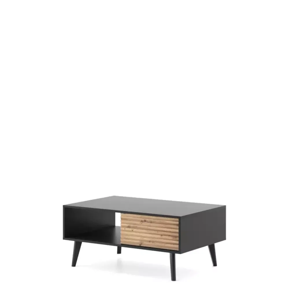 - Ława do salonu VITERBO do salonu w modnym i nowoczesnym stylu z jedną szufladą ryflowaną w kolorze dąb artisan. Ława jest na czarnych drewniano-bukowych nogach. Szuflada otwiera się dzięki push to open.