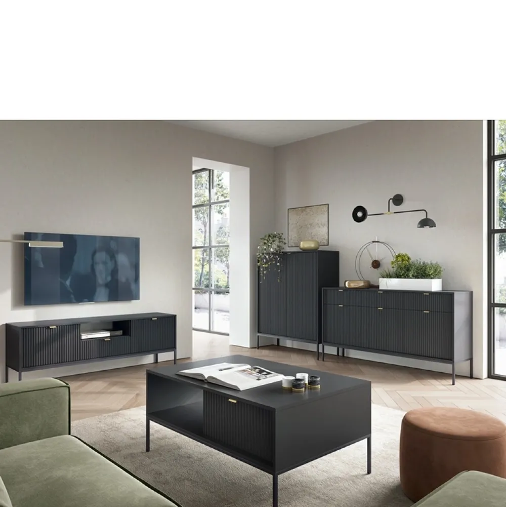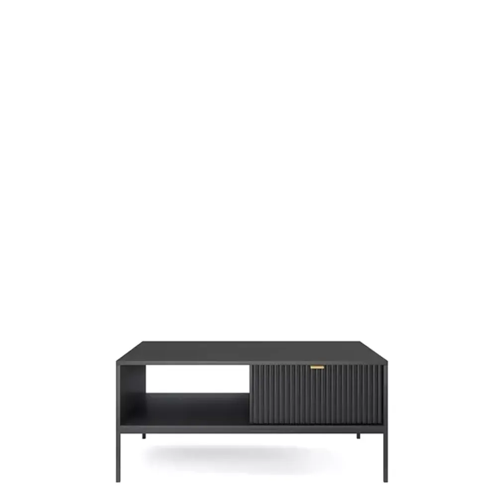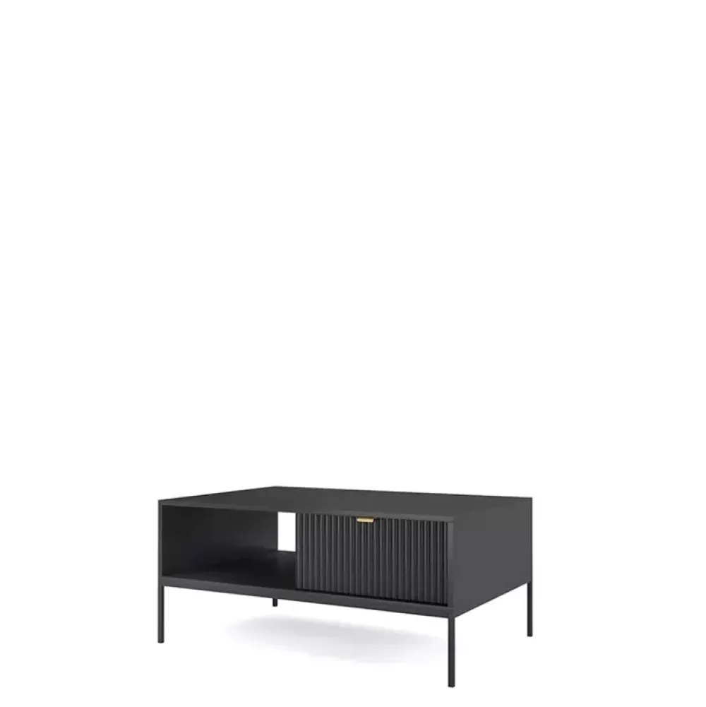 Czarny stolik kawowy AVANTI idealnie odnajdzie się w towarzystwie mebli do salonu z kolekcji AVANTI. Ława ma blat w kształcie prostokąta o wymiarach 104×68, więc bez problemu postawisz na nim paterę z ciastem, gdy wpadną do Ciebie goście na popołudniową kawę. Stolik kawowy ma półkę oraz pojemną szufladę pod blatem, więc znajdziesz miejsce na odłożenie pilota lub czytaną gazetę. Czarna ława z ryflowanym frontem szuflady będzie ozdobą w salonie. Postaw ją przy wygodnym narożniku i stwórz aranżację, jak z czasopisma wnętrzarskiego.