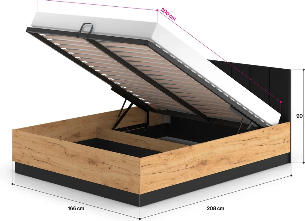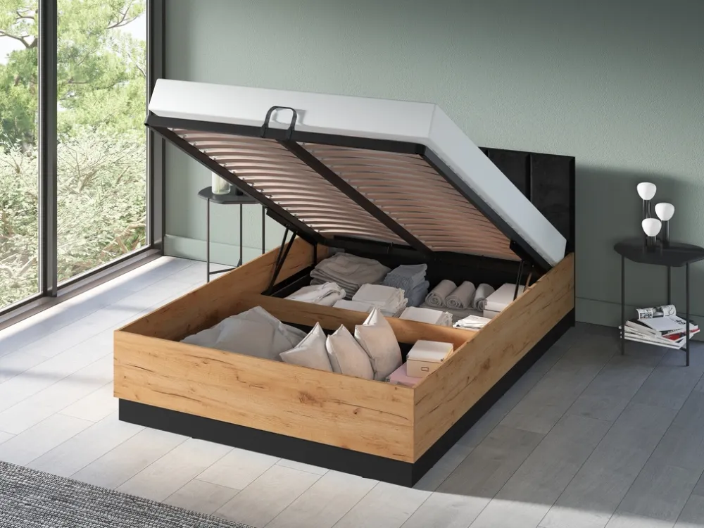 - Łóżko z pojemnikiem na pościel – idealne do przechowywania pościeli, koców czy sezonowej odzieży