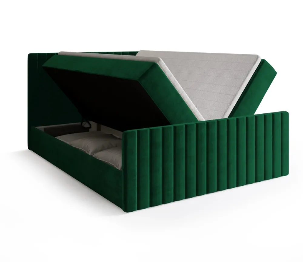 - Zielone łóżko kontynentalne DREAM DUO 180×200 cm obite welurową tkaniną Kronos 19. Wyposażone w materac ze sprężynami bonell, dwoma pojemnikami i tapicerowanym zagłówkiem. Komfortowy sen i elegancja w Twojej sypialni – idealne do nowoczesnych wnętrz.