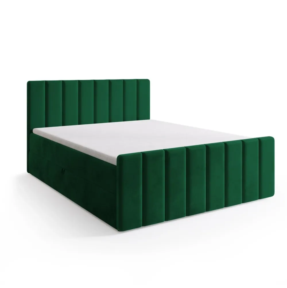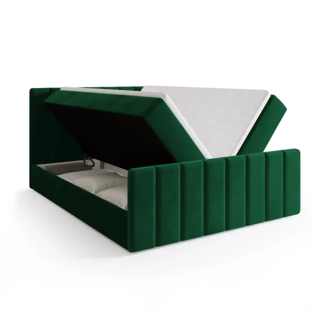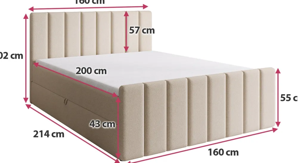 - Łóżko do sypialni 160×200 cm kontynentalne posiada praktyczny pojemnik na pościel, do którego dostęp ułatwia mechanizm otwierania wspomagany sprężynami. W zestawie znajduje się materac o średniej twardości, oparty na sprężynach bonell.