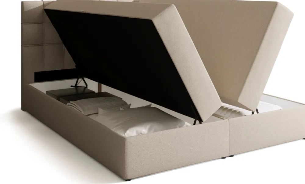 Łóżko kontynentalne do sypialni posiada dwa pojemniki na pościel, do których dostęp ułatwia automat sprężynowy. Podczas otwierania pojemnika na pościel, automat przejmuje na siebie ciężar powierzchni spania oraz wspomaga rozkładanie, dzięki czemu dostęp do zawartości pojemnika na pościel jest niezwykle prosty i przyjemny.