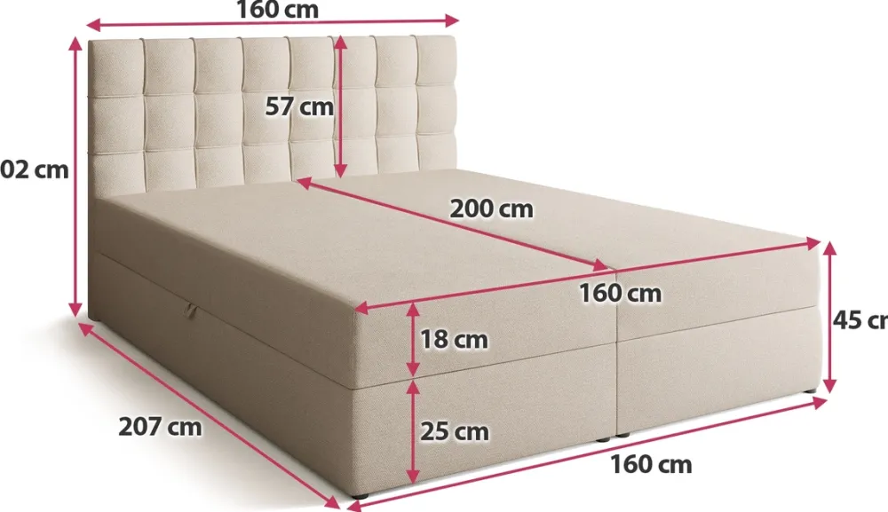- Łóżko kontynentalne 160×200 DETROIT posiada miękki, pikowany zagłówek z widocznymi przeszyciami. Materac łóżka został wykonany na bazie grubych sprężyn bonell oraz pianki T-30. Pod powierzchnią spania znajdują się dwa pojemniki z automatem sprężynowym.