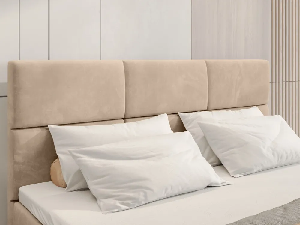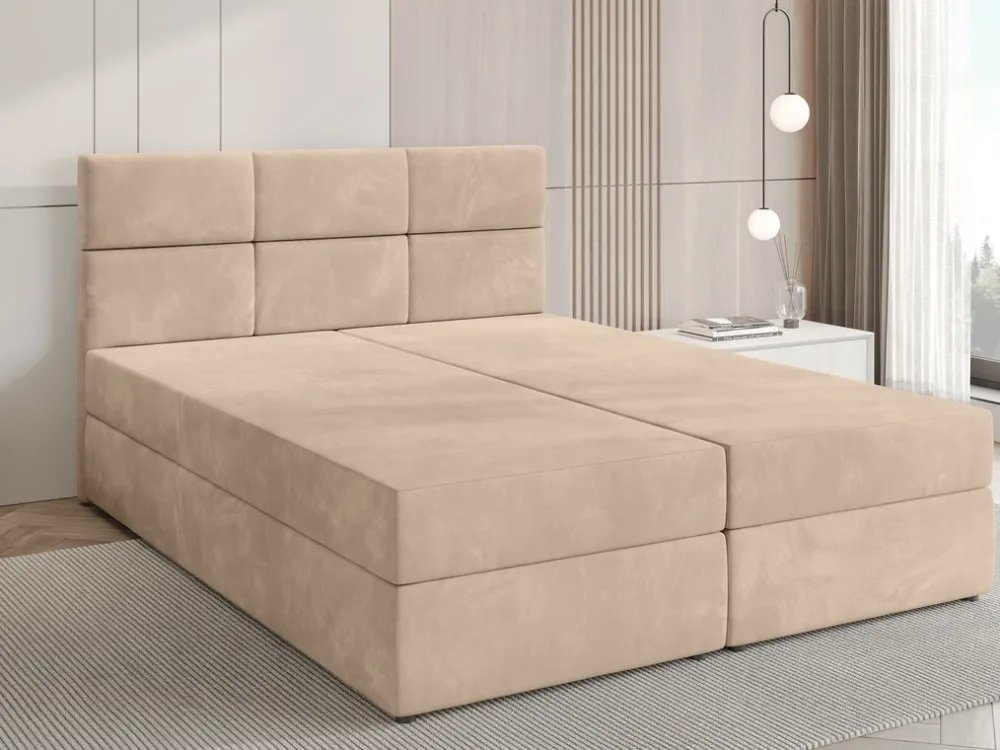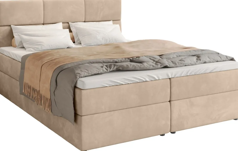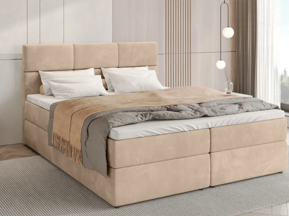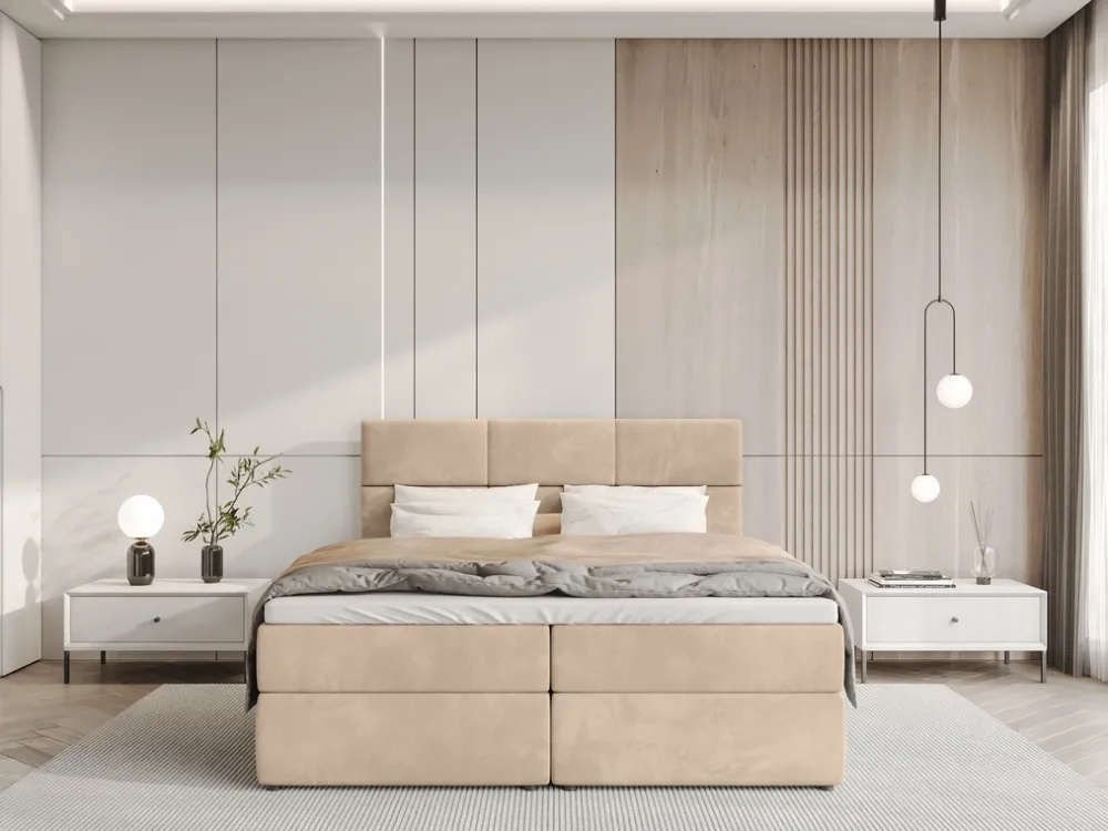 Łóżko kontynentalne 180×200 cm BOSTON to idealne połączenie nowoczesności i komfortu dla osób, które cenią sobie wygodę oraz solidne i estetyczne wykonanie. Welurowe łóżko kontynentalne do sypialni posiada zagłówek z ozdobnymi przeszyciami tworzącymi sześć prostokątów.