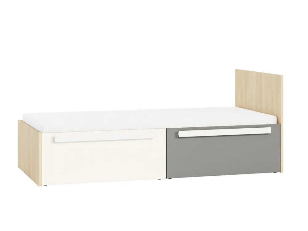 Młodzieżowe łóżko ze stelażem DROP to nowoczesny i funkcjonalny mebel, który łączy estetykę z praktycznością. Wyposażone jest w stelaż szczebelkowy, który zapewnia stabilne i komfortowe podparcie dla materaca, co przekłada się na wygodny sen. Powierzchnia spania o wymiarach 90×200 cm jest idealna dla jednej osoby. Pod łóżkiem znajdują się dwie szuflady z drewnianymi uchwytami, które oferują dodatkową przestrzeń do przechowywania, pomagając utrzymać porządek w pokoju.