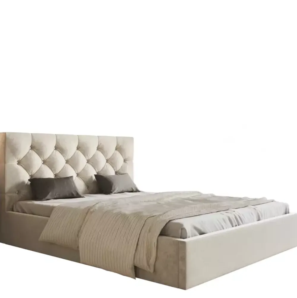 - Łózko z wysokim zagłówkiem, jego powierzchnię zdobią gęste, głębokie piki udekorowane kryształkami. W konfiguratorze oferujemy możliwość zmiany wysokości zagłówka, opcję wymiany stelaża drewnianego na metalowy lub wyposażenie pojemnika w twarde dno HDF.