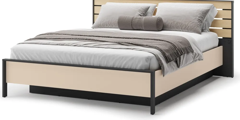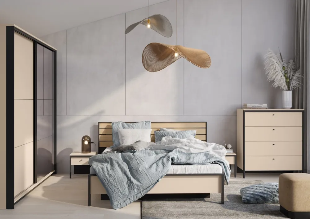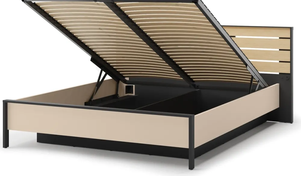 Łóżko ENNA zostało wykonane z wysokiej jakości płyty wiórowej laminowanej o grubości 16 i 22 mm, co zapewnia trwałość i stabilność konstrukcji. Zagłówek oraz elementy dekoracyjne zawierają listwy MDF, które nadają meblowi nowoczesnego charakteru. Wszystkie krawędzie zostały zabezpieczone obrzeżem ABS, co zwiększa odporność na uszkodzenia mechaniczne i wilgoć. Metalowy stelaż z podnośnikiem gazowym gwarantuje wygodne użytkowanie i długą żywotność. Całość dopełnia elegancka kolorystyka w odcieniach beżu, czerni i dębu Vincenza, doskonale wpisująca się w nowoczesne aranżacje sypialni.