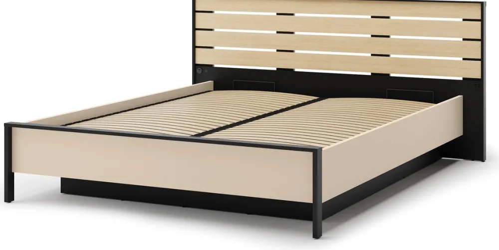 - Łóżko z kolekcji ENNA 160×200 z pojemną skrzynią, oświetleniem LED i metalowym stelażem. Beż, czerń i dąb vincenza tworzą modny zestaw. Nowoczesny design i komfort w jednym – idealne do stylowej sypialni.