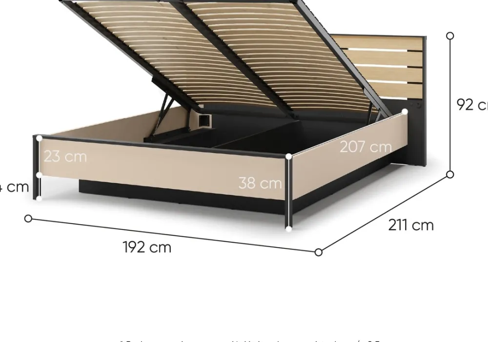 - Stelaż: metalowy, podnoszony, o wymiarach 160×200 cm