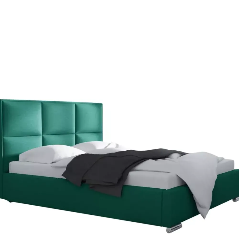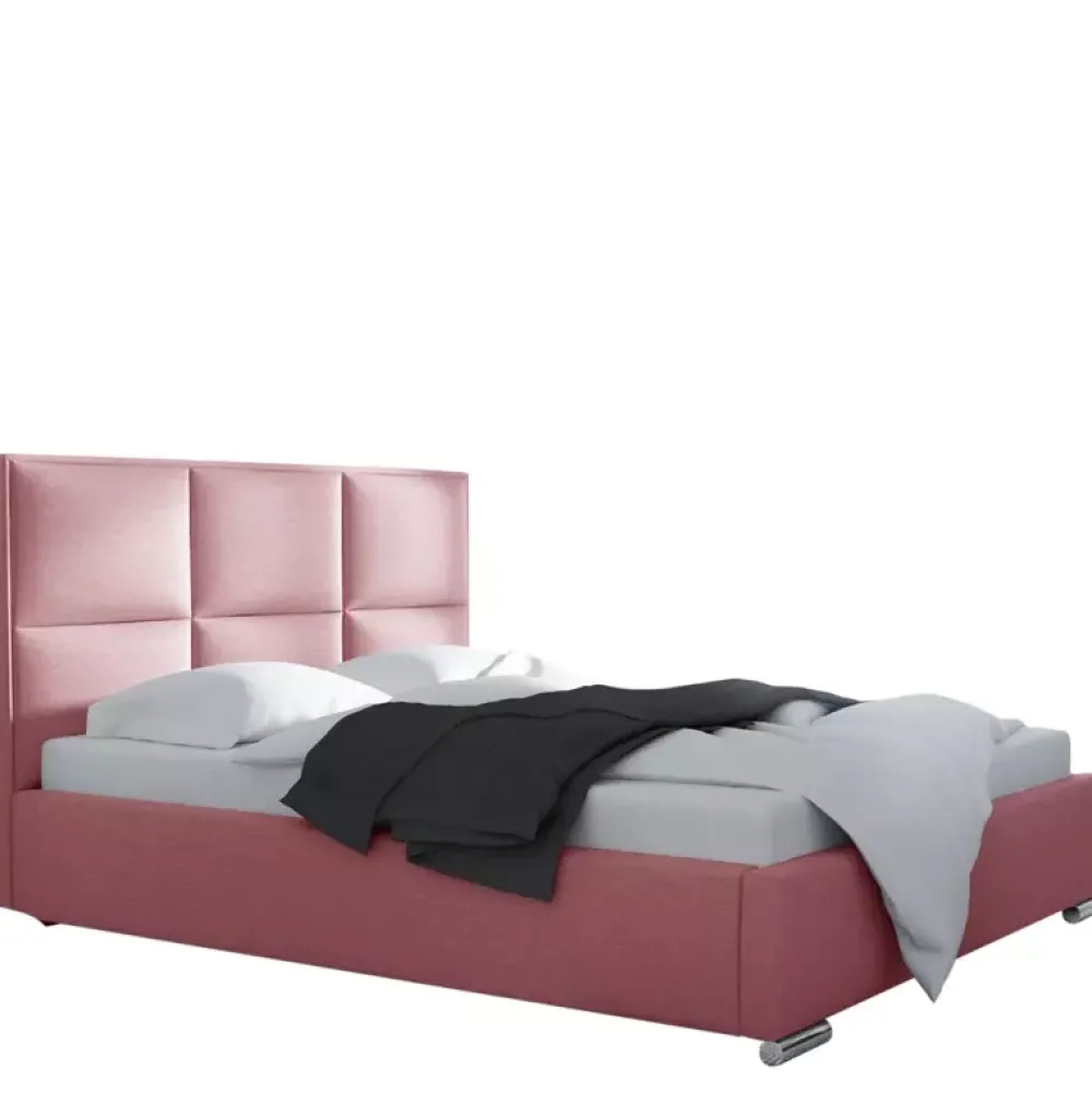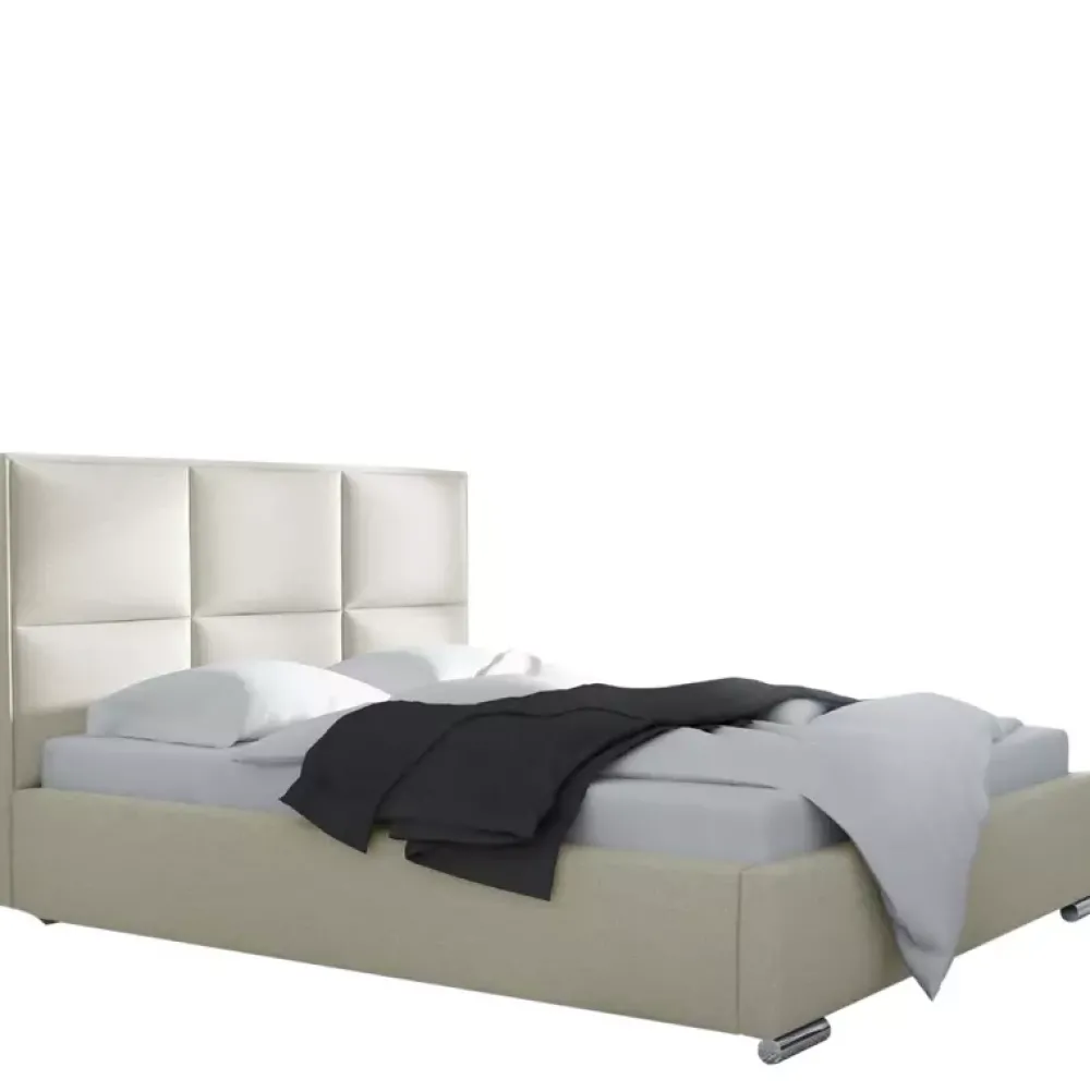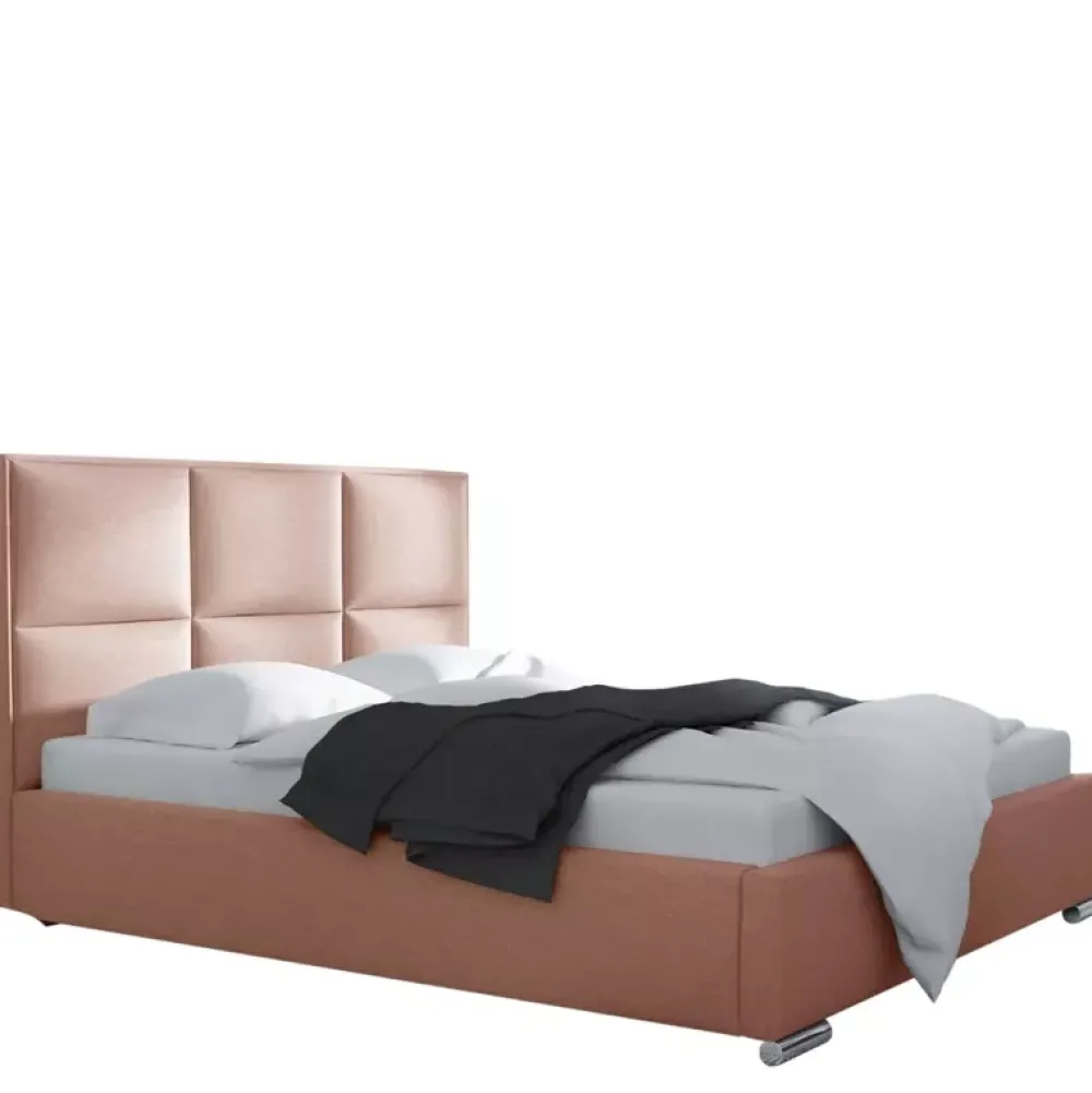 - Łóżko do sypialni z wysokim oparciem. Łóżko dostępne w wariantach z obiciem z ekoskóry oraz innych tkanin wysokiej jakości. Powierzchnia spania o wymiarach 140×200 cm.