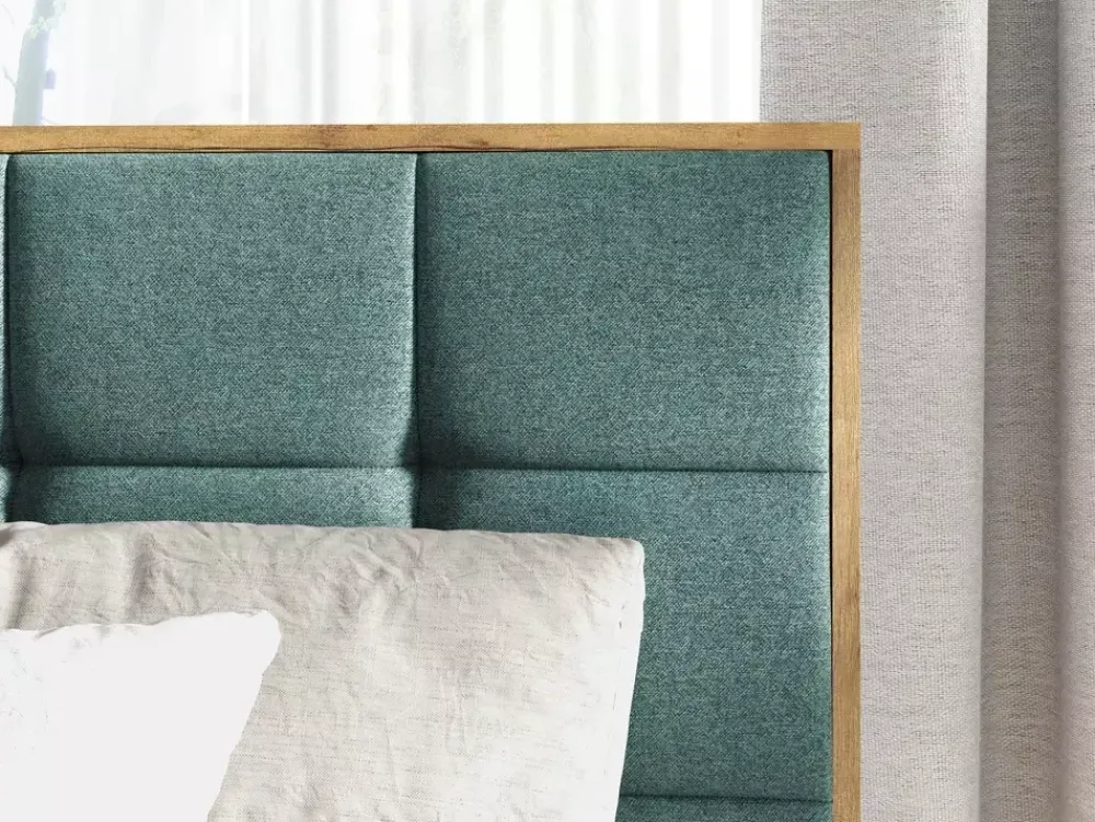 Zagłówek tego łóżka jest wyjątkowy, z tapicerowanymi przeszyciami układającymi się w geometryczny wzór małych kwadratów. Ta drobna szczegółowość dodaje subtelnej elegancji, tworząc wyrafinowany akcent w każdej sypialni.