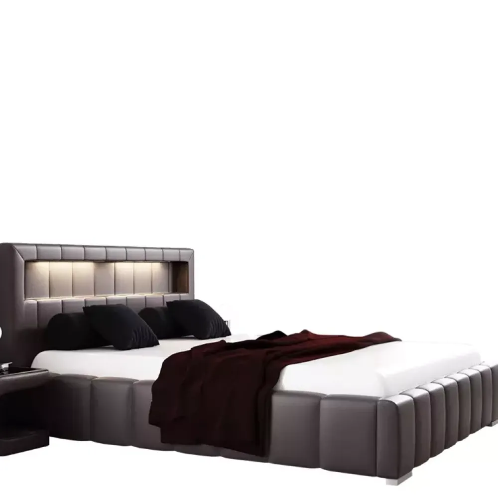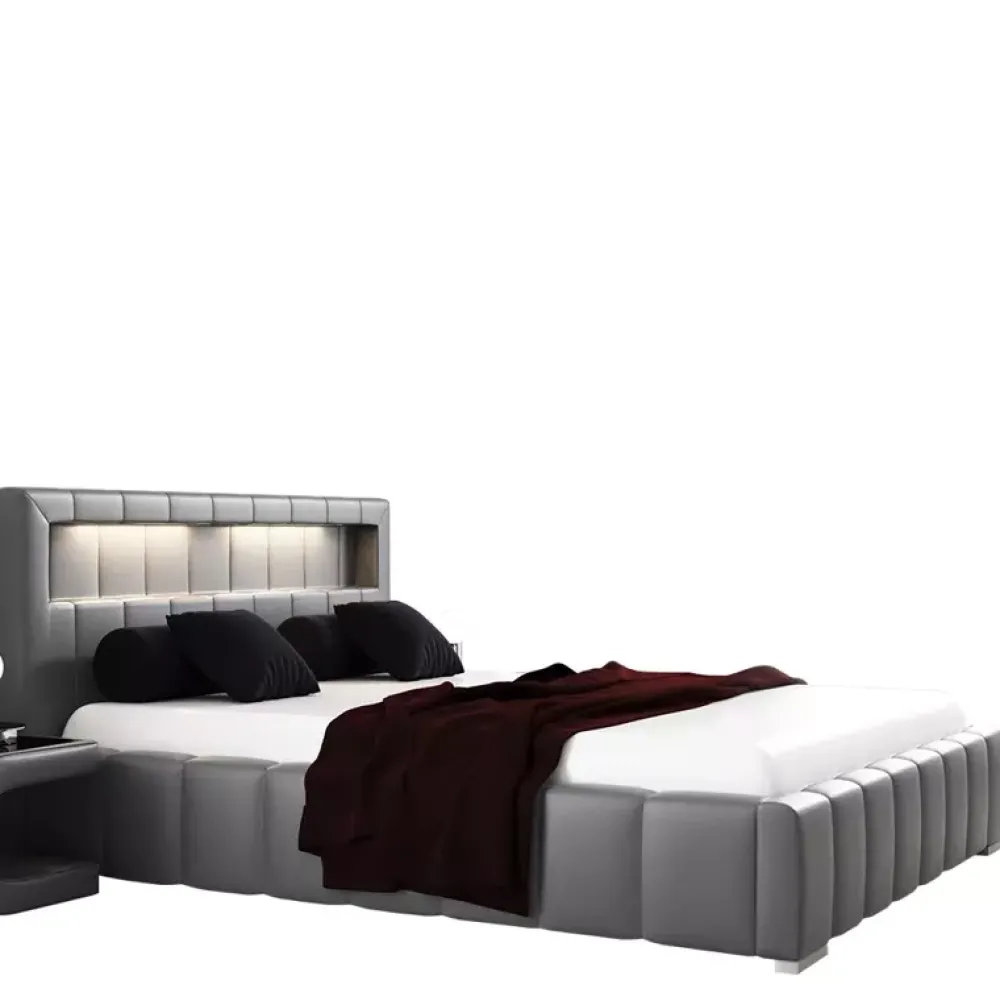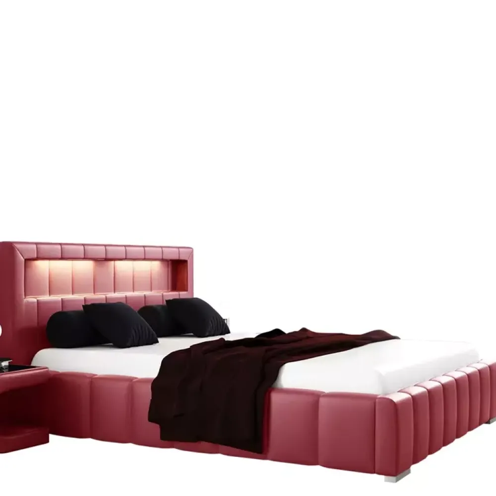 - Wysokiej jakości łóżko tapicerowane z podświetleniem LED w zagłówku. Powierzchnia spania o wymiarach 160×200 cm wykończona dookoła ramką pokrytą skórą z przeszyciami w prosty wzór.