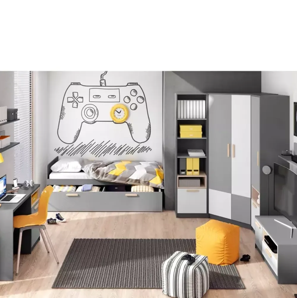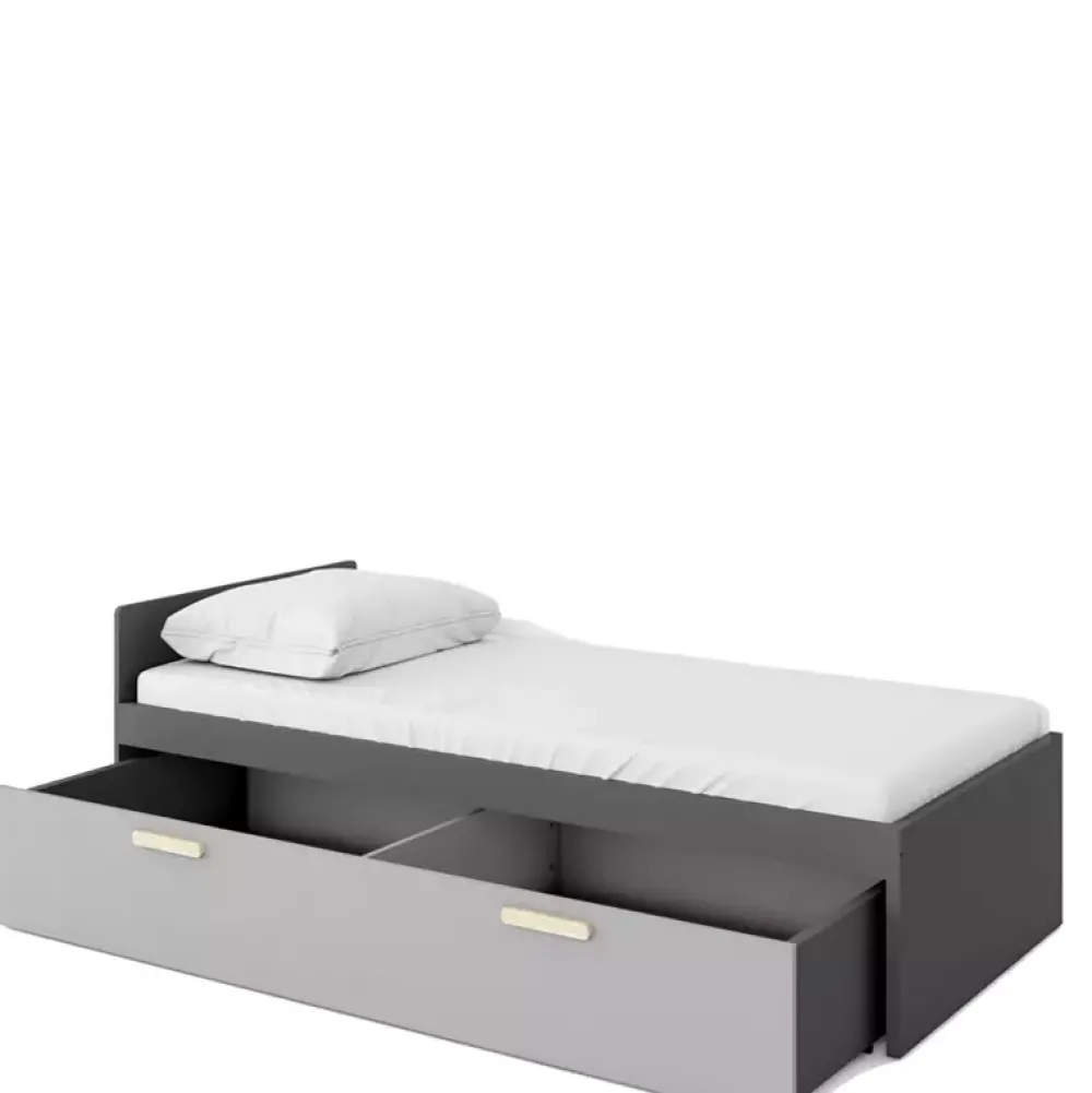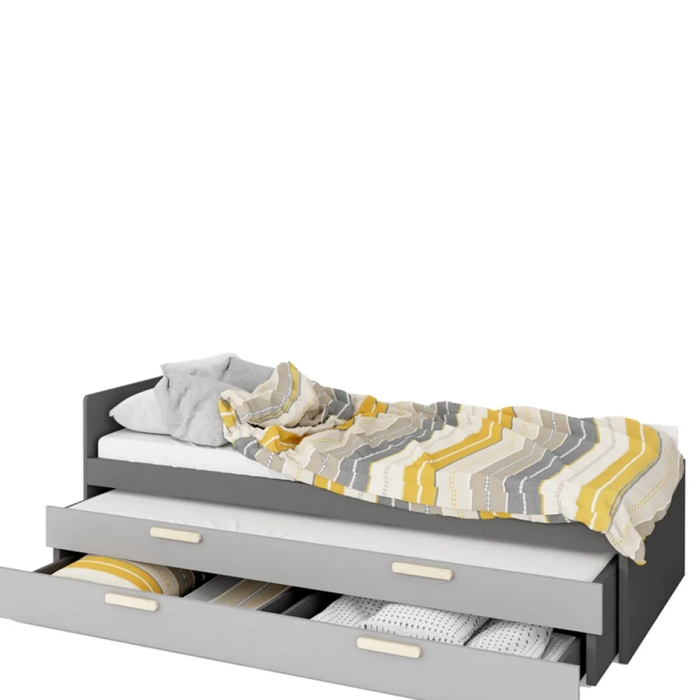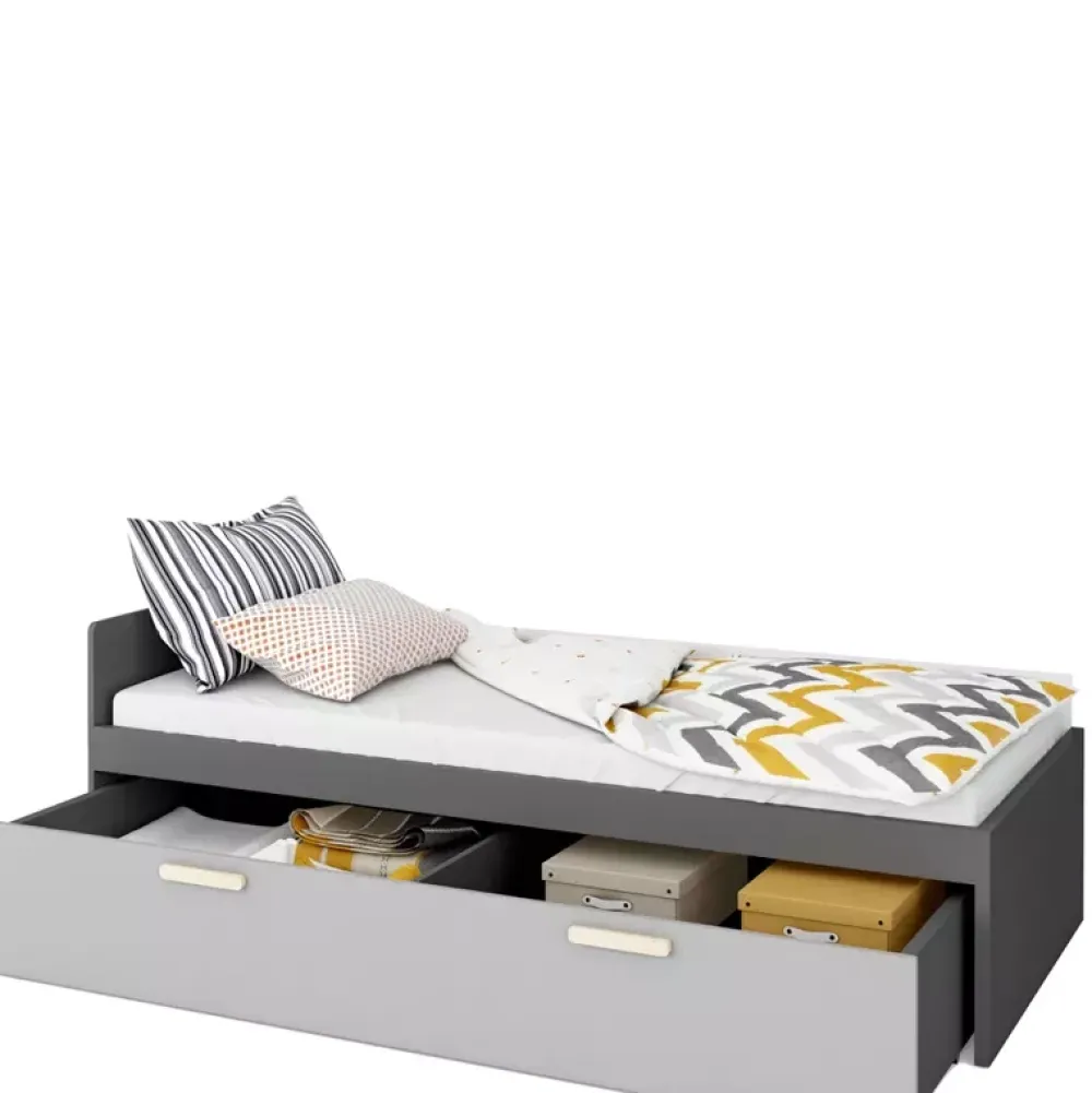 Łóżko do pokoju młodzieżowego posiada możliwość doposażenia w opcjonalny pojemnik na pościel w formie szuflady lub szufladę w formie łóżka z materacem oraz pojemnikiem na pościel, który pozwala na przechowanie znacznej ilości koców oraz poduszek.