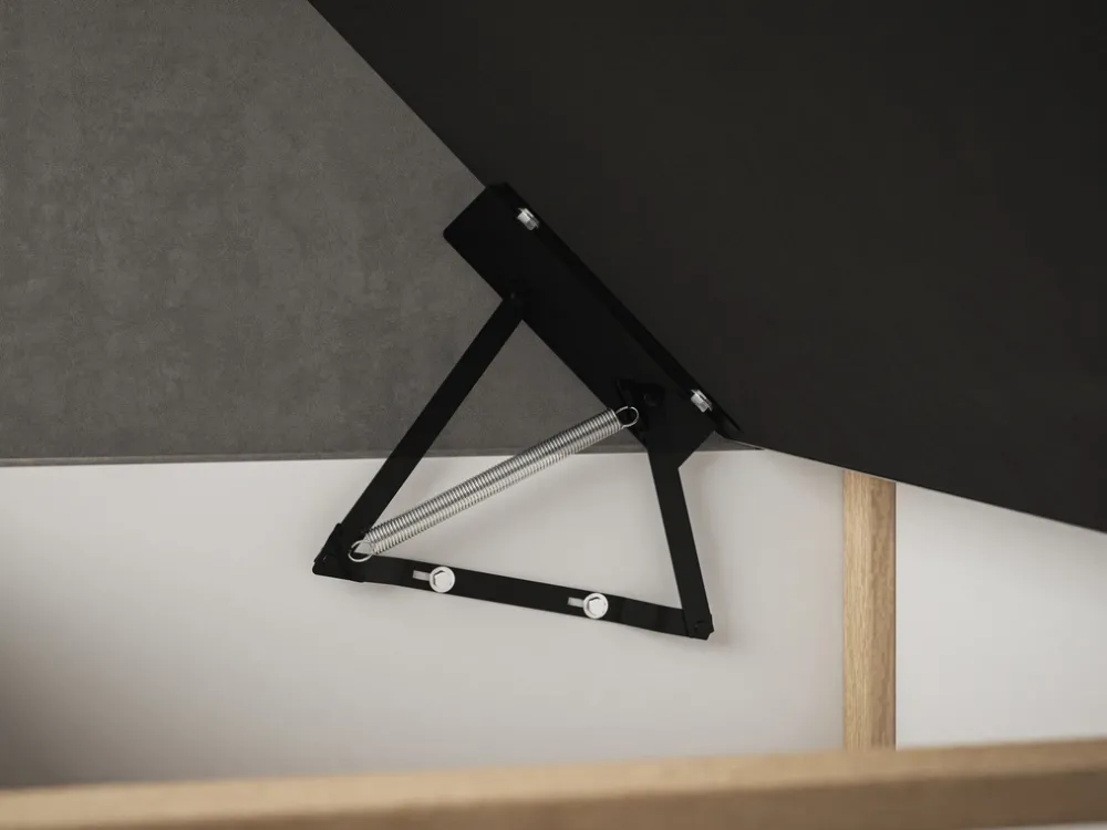 - Łóżko posiada pojemnik na pościel o wysokości 26 cm podzielony na dwie części, którego rozkładanie jest wspomagane za pomocą automatu sprężynowego.