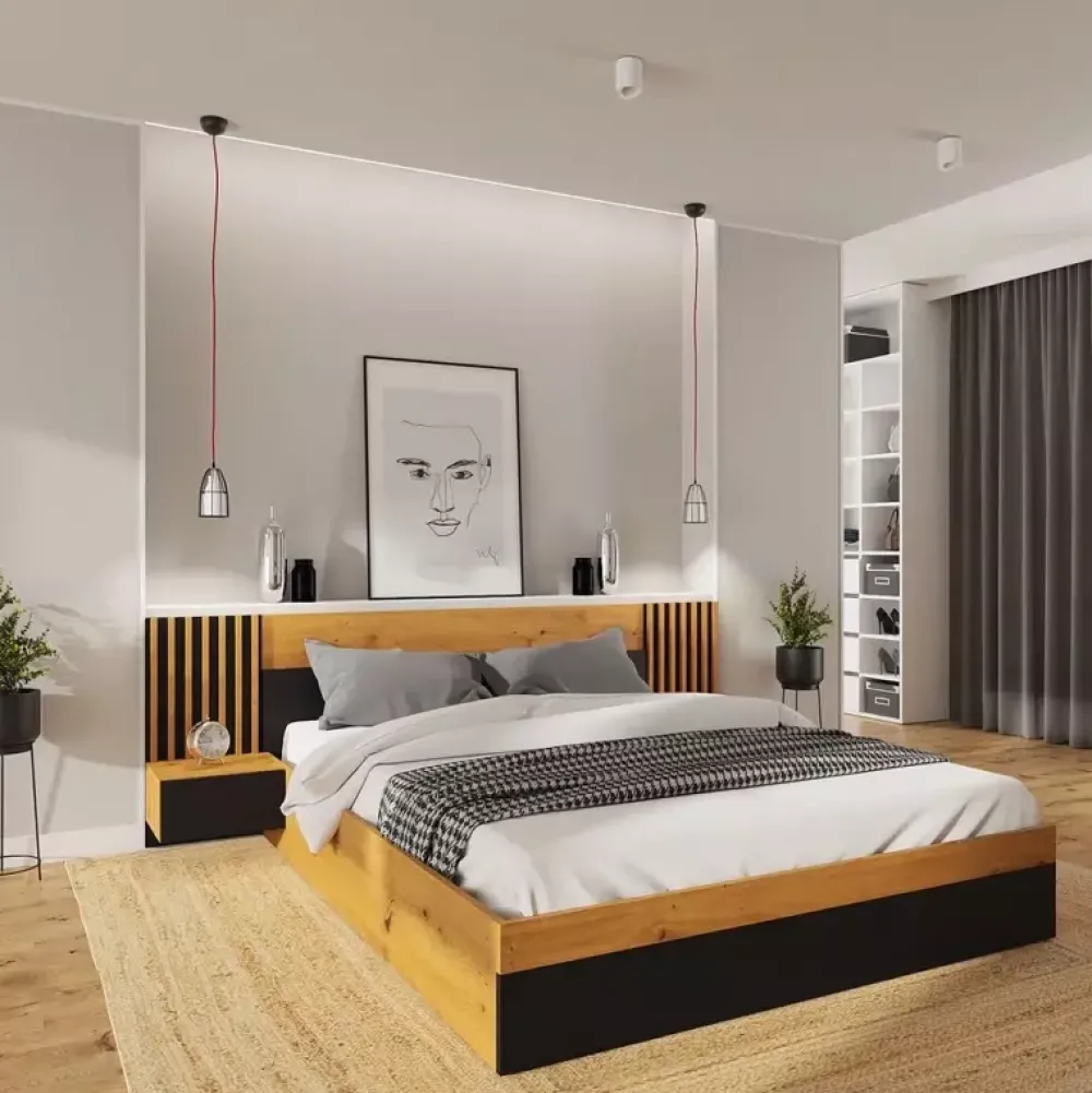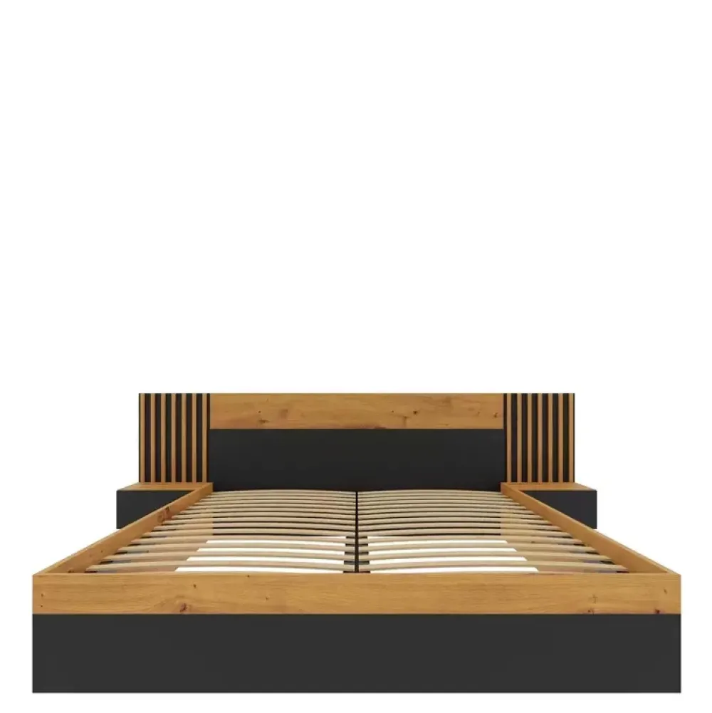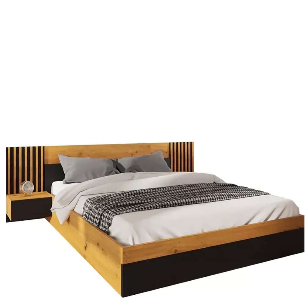 Łóżko sypialniane NELGARI to propozycja wykonana w ponadczasowej, oraz przyciągającej uwagę kolorystyce. Korpus łóżka został wykonany w kolorze dąb artisan, natomiast front i dodatki w kolorze czarnym. Łóżko posiada zagłówek oraz miejsce na materac i stelaż o powierzchni 180×200 cm, która gwarantuje komfortową ilość miejsca dla dwóch osób. Dodatkowo szafki pozwalają zyskać miejsce na lampki nocne, pozwalające na dodatkowe światło.