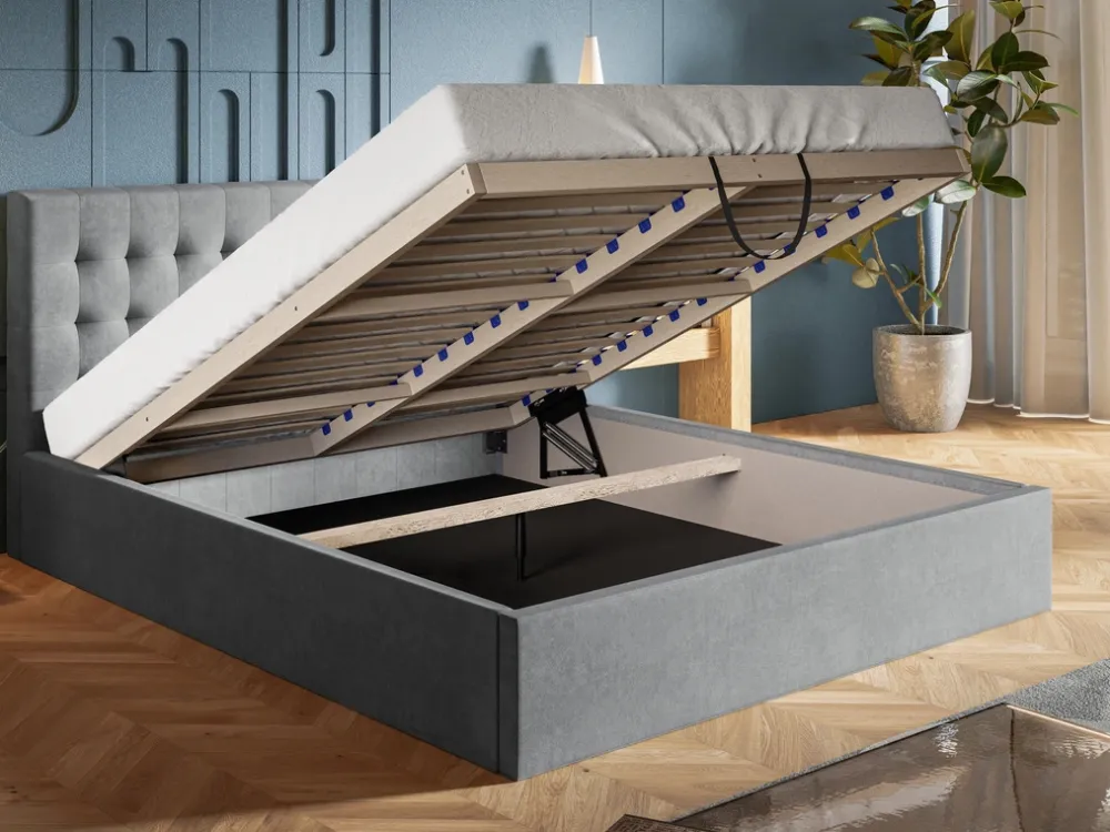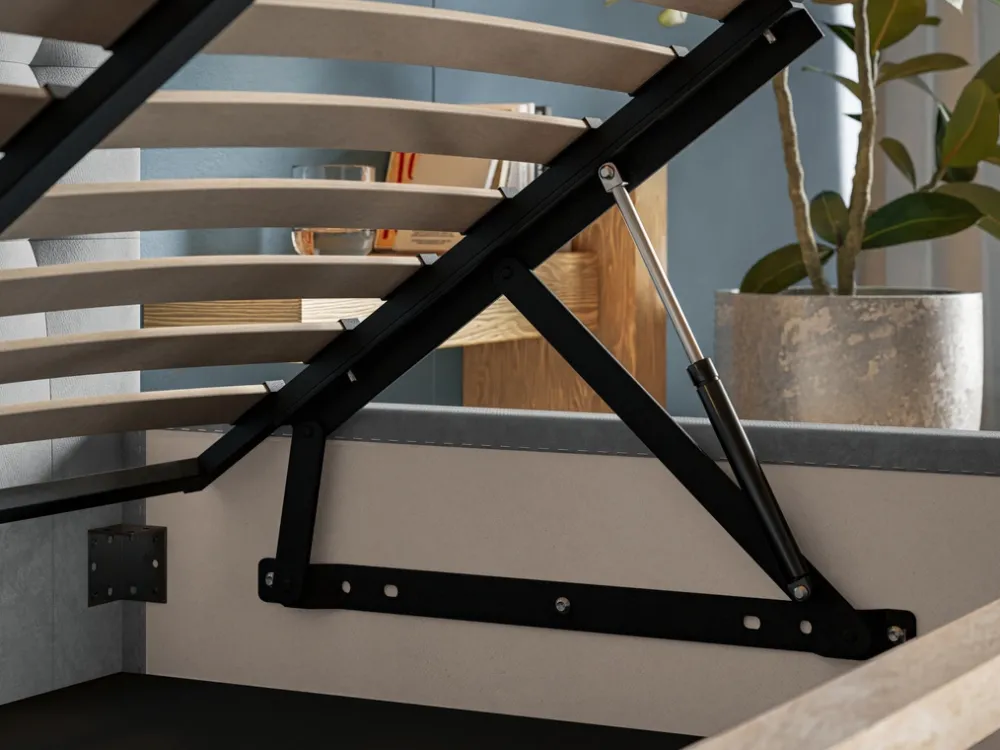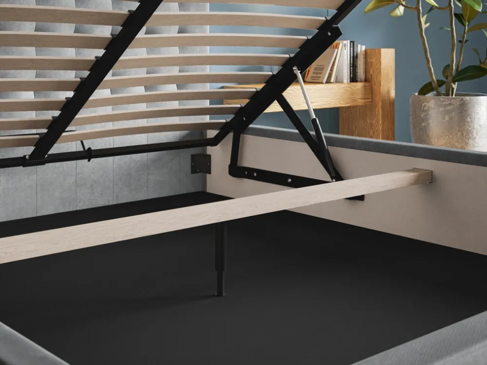 - Opcjonalnie stelaż drewniany za dopłata zmienić można na wersję z ramą wykonaną z metalu, podnoszoną na siłownikach gazowych. W tej wersji stelaż składa się z 36 brzozowych listew sprężynujących. Uchwyt służący do podnoszenia stelaża w kolorze losowym, element niewidoczny. Obciążenie maksymalne to 200 kg.