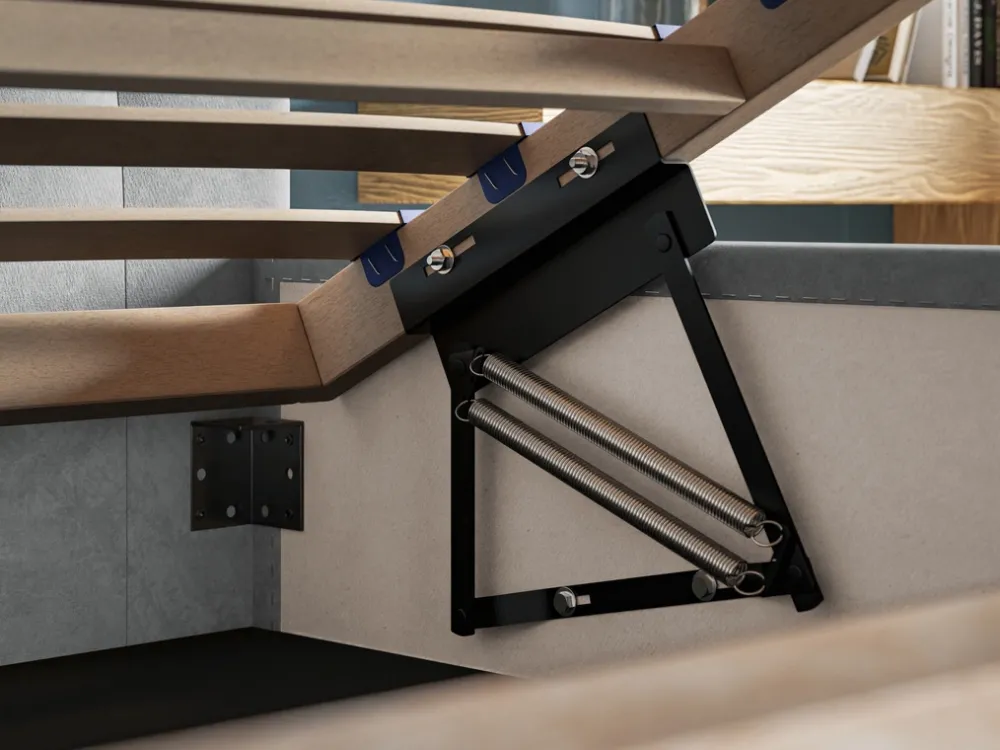 - Łóżko w standardzie wyposażone jest w drewniany stelaż składający się z 32 brzozowych listew, mocowanych w plastikowych uchwytach, stelaż w całości unoszony jest na podnośnikach sprężynowych. Rama stelaża wykonana jest ze sklejki. Rączka do podnoszenia wykonana jest w losowym kolorze, element niewidoczny po nałożeniu materaca. Poszczególne listewki oddalone są od siebie o około 5-5,5 cm. Maksymalne obciążenie stelaża to 200kg.