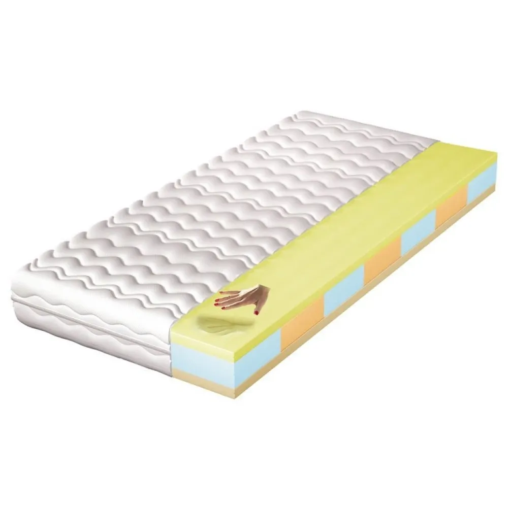 - Materac piankowy z wkładem z pianki T25 o grubości 10 cm ułożonym w 7 stref, z jednej strony obłożony pianką visco a z drugiej pianką wysokoelastyczną, dwustronny – średnio twardy.