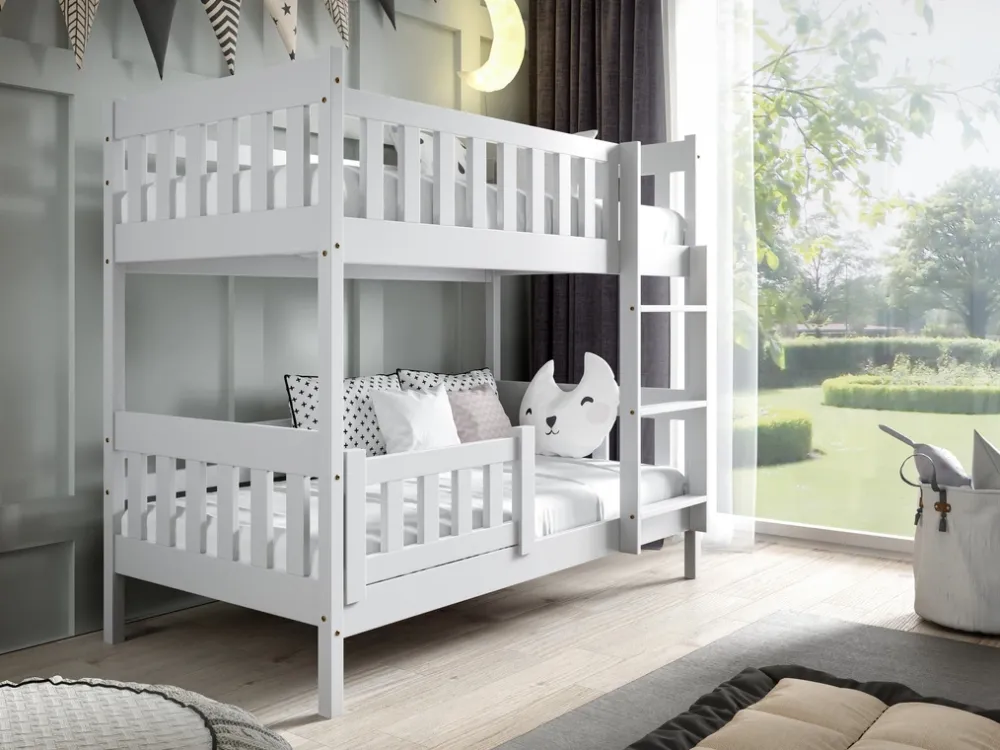 Odkryj idealne rozwiązanie do pokoju Twojego dziecka — eleganckie, białe łóżko piętrowe LUMISLE wykonane z wysokiej jakości drewna sosnowego. Nie tylko doskonale komponuje się z każdym wnętrzem dzięki swojej klasycznej estetyce, ale także stanowi wyjątkowo bezpieczne i funkcjonalne miejsce do odpoczynku dla Twoich pociech.