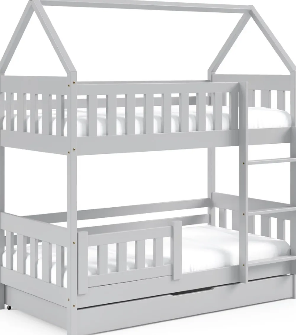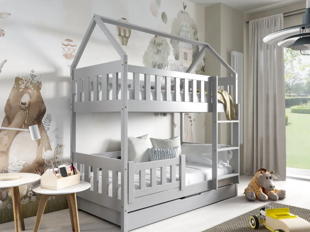 - Piętrowe łóżko-domek do pokoju dziecięcego MELANIA wyposażone w pojemną szufladę, drabinkę, barierki ochronne oraz dwie powierzchnie spania o wymiarach 80×160 cm. Łózko wykonane z drewna sosnowego w wybarwieniu szarym. Łóżko bez materacy w zestawie.