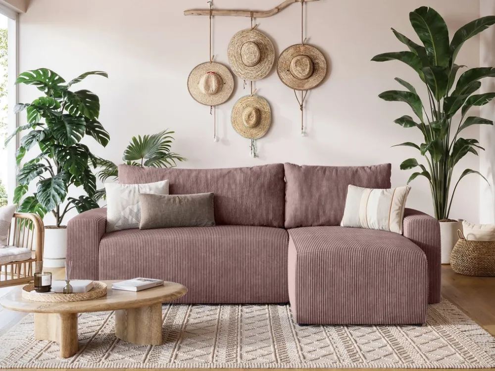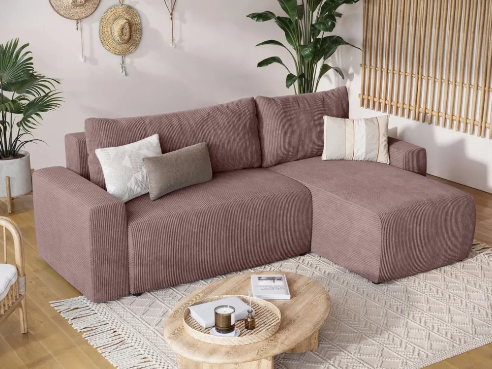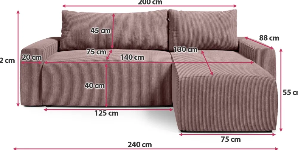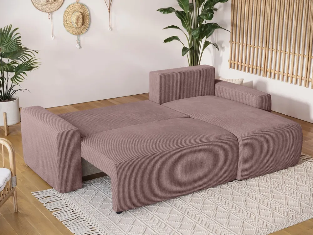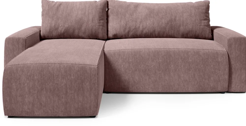 - Narożnik z funkcją spania PLUSH L został wykonany w tkaninie sztruksowej POSO która doskonale wpisuje się we współczesne trendy wyposażenia wnętrz. Pod siedziskiem narożnika znajduje się głęboki pojemnik na pościel. Powierzchnia spania 125×200 cm.