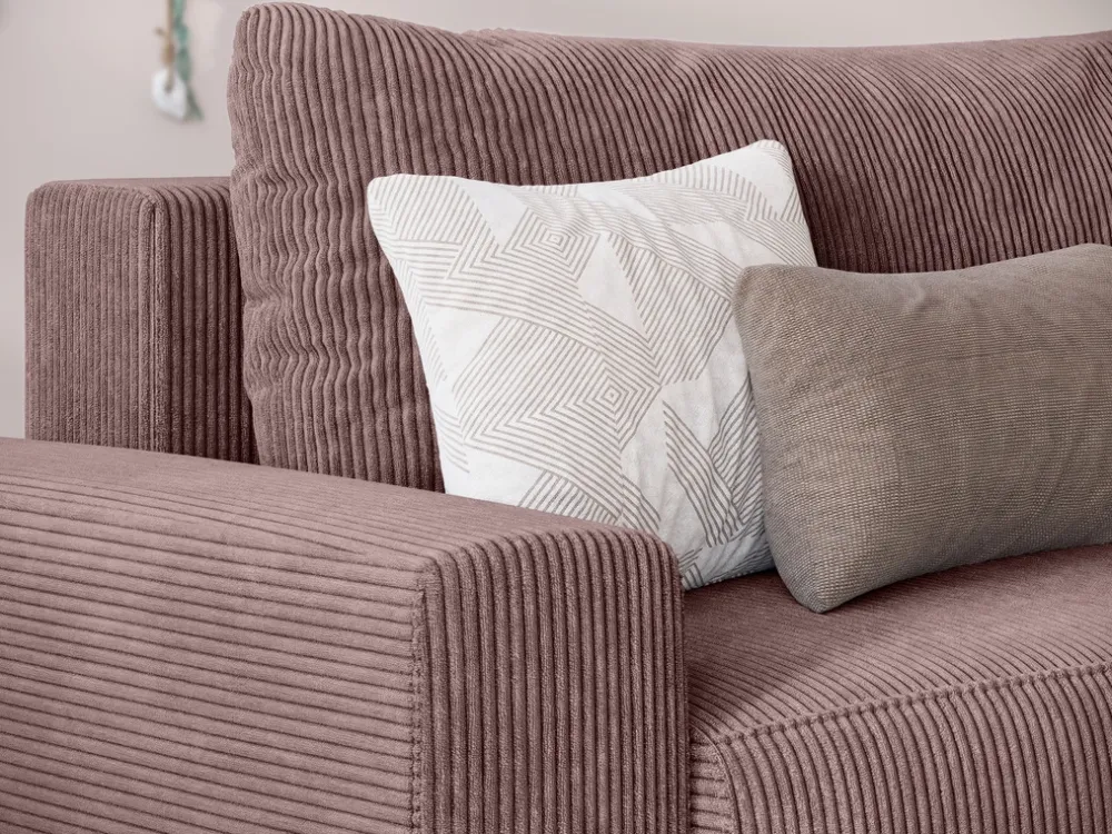 Narożnik został obity elegancką tkaniną sztruksową, która dodaje mu wyjątkowego charakteru. Sztruks jest materiałem nie tylko stylowym, ale również bardzo przyjemnym w dotyku, co dodatkowo podnosi komfort użytkowania. Dwie duże poduchy oparciowe zapewniają wygodne wsparcie dla pleców, a tapicerowane plecy narożnika pozwalają na swobodne ustawienie go w dowolnym miejscu w salonie, bez konieczności przylegania do ściany.