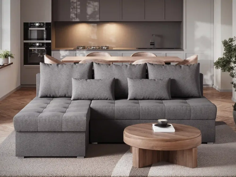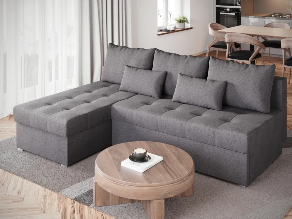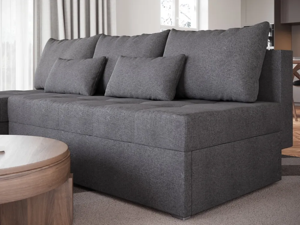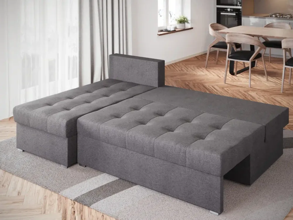Narożnik wyposażony jest w funkcję spania, co sprawia, że w kilka chwil można zamienić go w łóżko o powierzchni 120×200 cm. To praktyczne rozwiązanie, które idealnie sprawdzi się podczas wizyt gości, a także pozwoli zaoszczędzić miejsce w salonie. Pod siedziskiem znajduje się pojemny schowek na pościel, który umożliwia wygodne przechowywanie koców, poduszek czy dodatkowej pościeli – wszystko w zasięgu ręki.