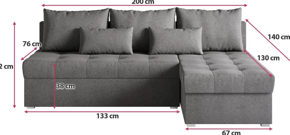 - Narożnik posiada funkcję spania o powierzchni 120×200 cm. Rozkładanie odbywa się za pomocą pociągnięcia siedziska do siebie oraz złożenia oparcia.