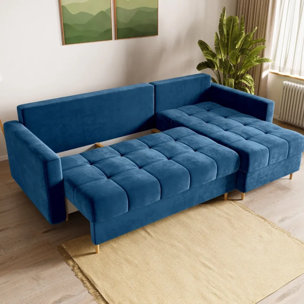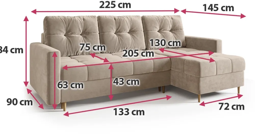 Wyposażony w funkcję spania o wymiarach 145×205 cm, ten narożnik zapewnia wygodne i przestronne miejsce do odpoczynku. Funkcja spania rozkładana jest za pomocą pociągnięcia siedziska do siebie oraz złożenia oparcia.