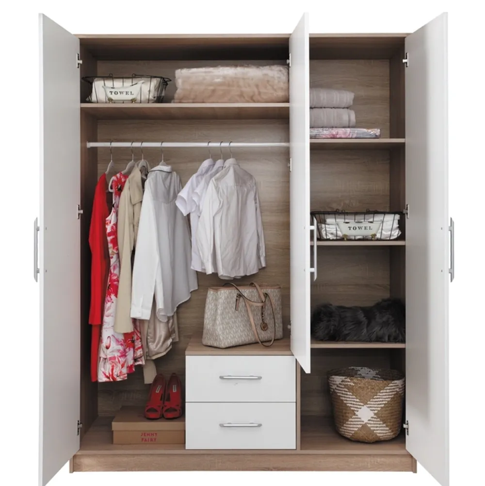 - Zestaw szaf SEVAS to propozycja dla osób poszukujących niebanalnych rozwiązań na wyposażenie sypialni. Zestaw obejmuje trzy pojemne szafy, które wyposażono w półki, drążki na wieszaki oraz szuflady. Obrzeża mebli zabezpieczono okleiną ABS.